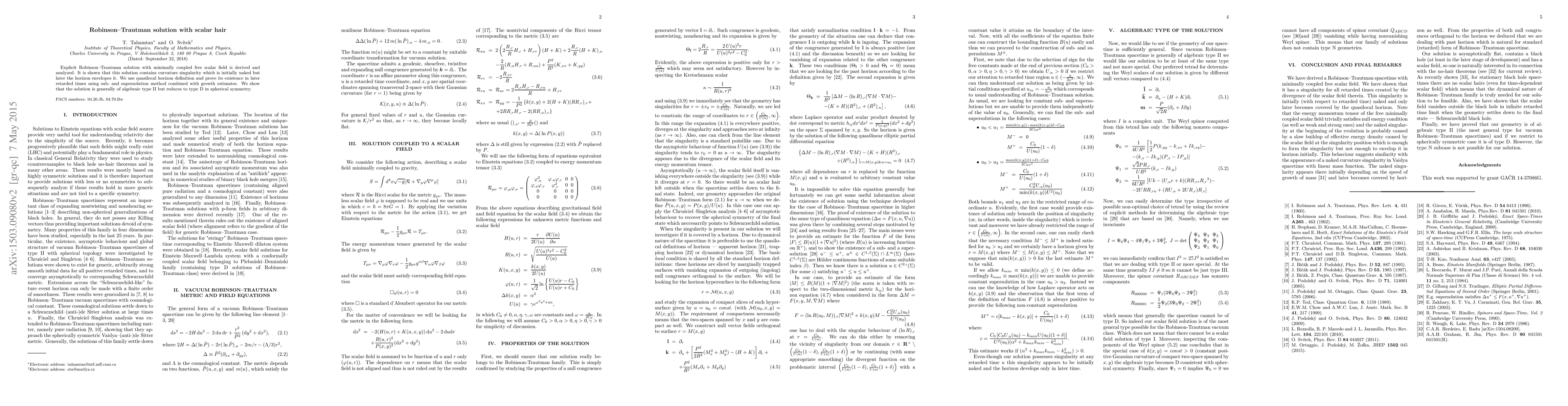 Explicit Robinson-Trautman solution with minimally coupled free scalar field is derived and analyzed. It is shown that this solution contains curvature singularity which is initially naked but later the horizon envelopes it. We use quasilocal horizon definition and prove its existence in later retarded times using sub- and supersolution method combined with growth estimates. We show that the solution is generally of algebraic type II but reduces to type D in spherical symmetry.
