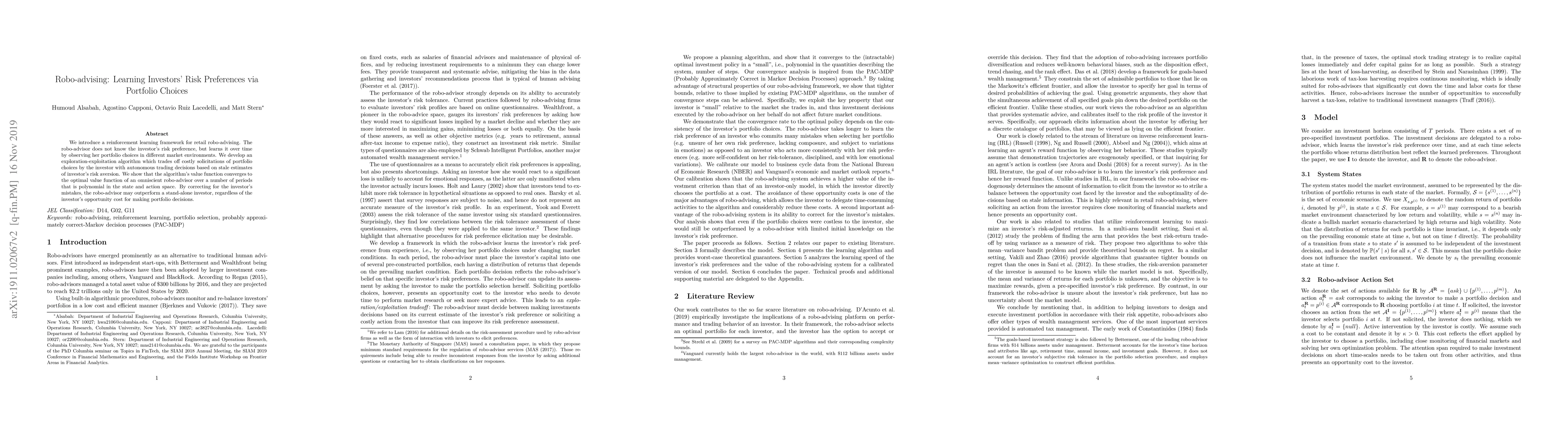 We introduce a reinforcement learning framework for retail robo-advising. The robo-advisor does not know the investor's risk preference, but learns it over time by observing her portfolio choices in different market environments. We develop an exploration-exploitation algorithm which trades off costly solicitations of portfolio choices by the investor with autonomous trading decisions based on stale estimates of investor's risk aversion. We show that the algorithm's value function converges to the optimal value function of an omniscient robo-advisor over a number of periods that is polynomial in the state and action space. By correcting for the investor's mistakes, the robo-advisor may outperform a stand-alone investor, regardless of the investor's opportunity cost for making portfolio decisions.