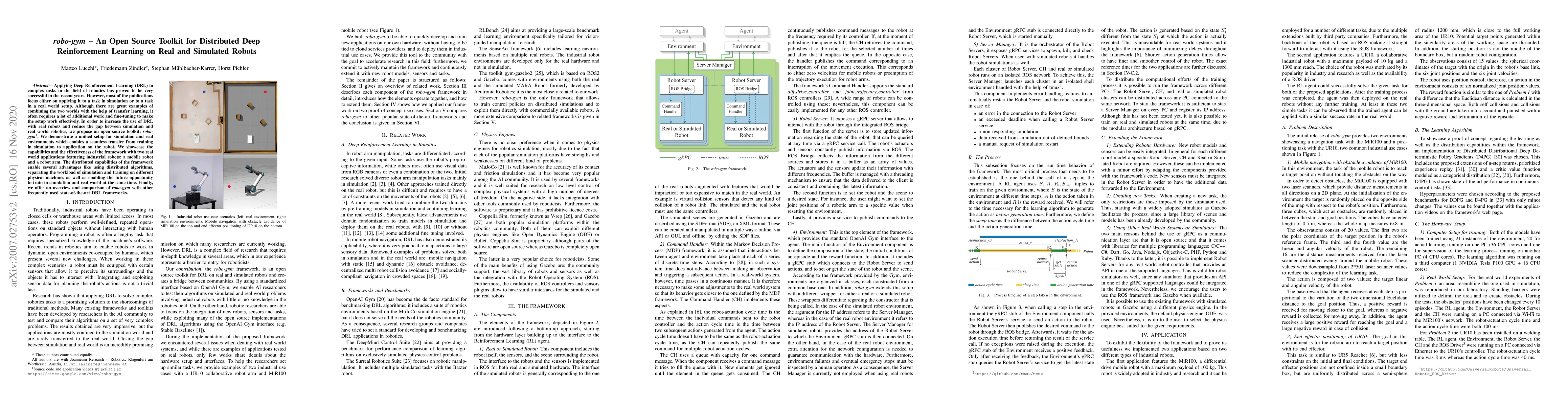 Robo-gym is an open source toolkit designed to facilitate distributed deep reinforcement learning (DRL) for both simulated and real robots, aiming to bridge the gap between simulation and real-world applications. It showcases effective transfer learning and distributed capabilities for industrial robots, highlighting its advantages over other state-of-the-art DRL frameworks.