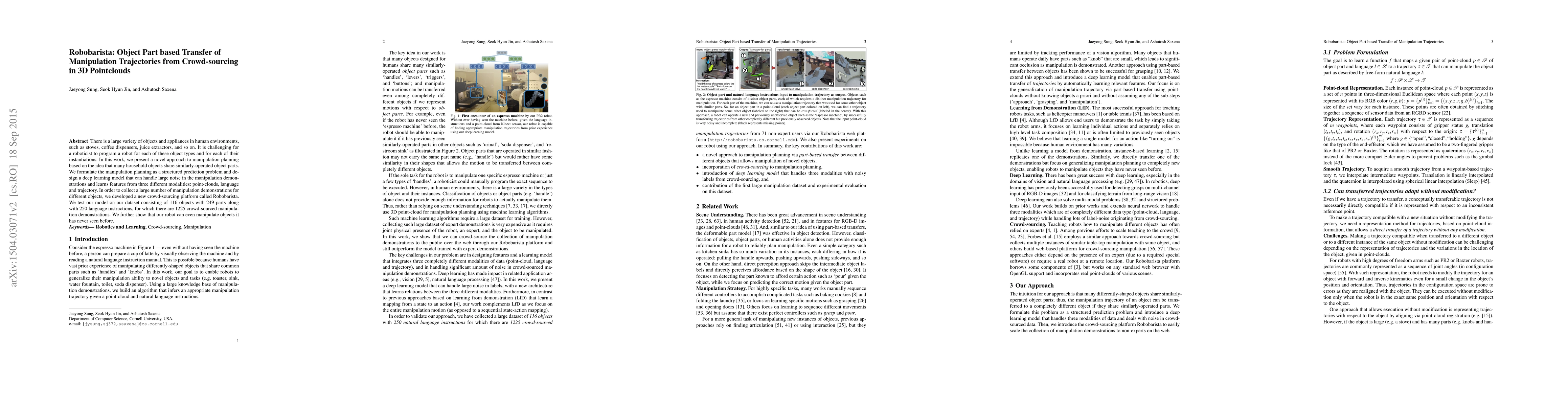 This paper introduces Robobarista, a crowd-sourced platform for collecting manipulation demonstrations, to enable robots to learn object manipulation from shared object parts. The proposed deep learning model leverages point-clouds, language, and trajectory data to generalize manipulation planning to unseen objects.