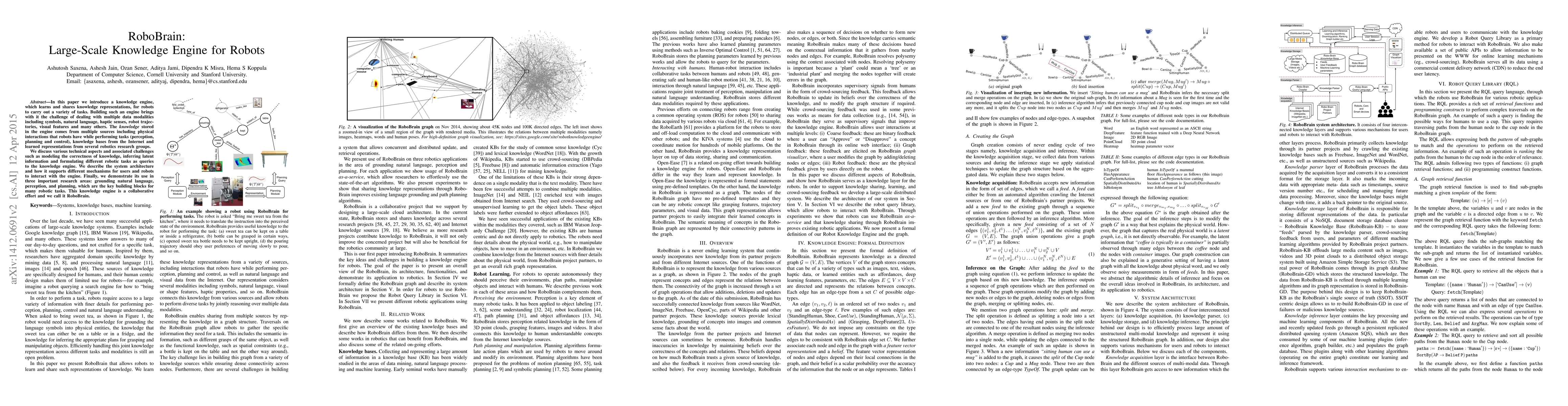 In this paper we introduce a knowledge engine, which learns and shares knowledge representations, for robots to carry out a variety of tasks. Building such an engine brings with it the challenge of dealing with multiple data modalities including symbols, natural language, haptic senses, robot trajectories, visual features and many others. The \textit{knowledge} stored in the engine comes from multiple sources including physical interactions that robots have while performing tasks (perception, planning and control), knowledge bases from the Internet and learned representations from several robotics research groups. We discuss various technical aspects and associated challenges such as modeling the correctness of knowledge, inferring latent information and formulating different robotic tasks as queries to the knowledge engine. We describe the system architecture and how it supports different mechanisms for users and robots to interact with the engine. Finally, we demonstrate its use in three important research areas: grounding natural language, perception, and planning, which are the key building blocks for many robotic tasks. This knowledge engine is a collaborative effort and we call it RoboBrain.