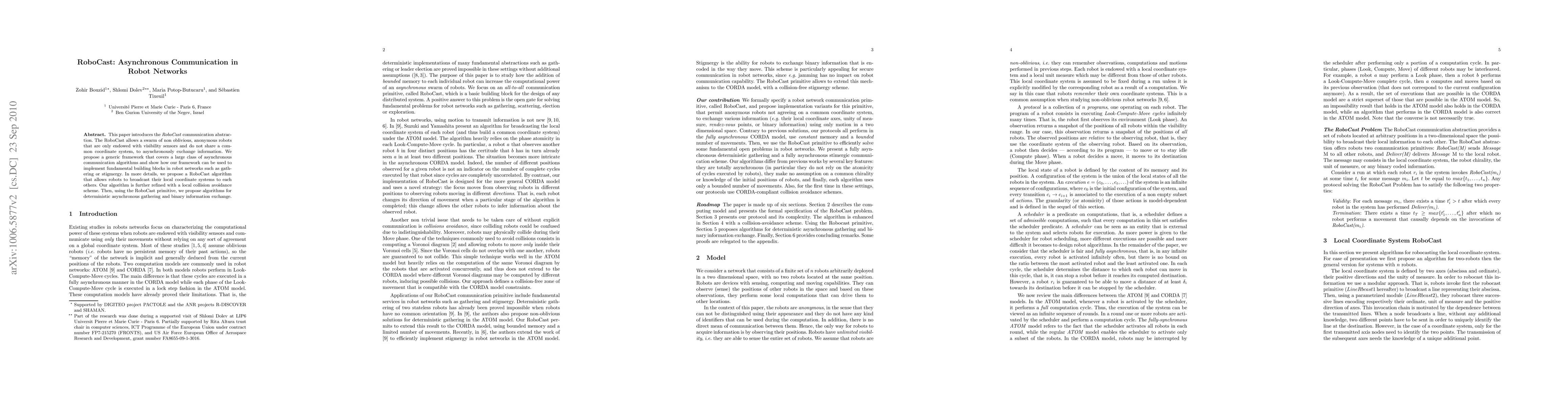 This paper introduces the \emph{RoboCast} communication abstraction. The RoboCast allows a swarm of non oblivious, anonymous robots that are only endowed with visibility sensors and do not share a common coordinate system, to asynchronously exchange information. We propose a generic framework that covers a large class of asynchronous communication algorithms and show how our framework can be used to implement fundamental building blocks in robot networks such as gathering or stigmergy. In more details, we propose a RoboCast algorithm that allows robots to broadcast their local coordinate systems to each others. Our algorithm is further refined with a local collision avoidance scheme. Then, using the RoboCast primitive, we propose algorithms for deterministic asynchronous gathering and binary information exchange.
