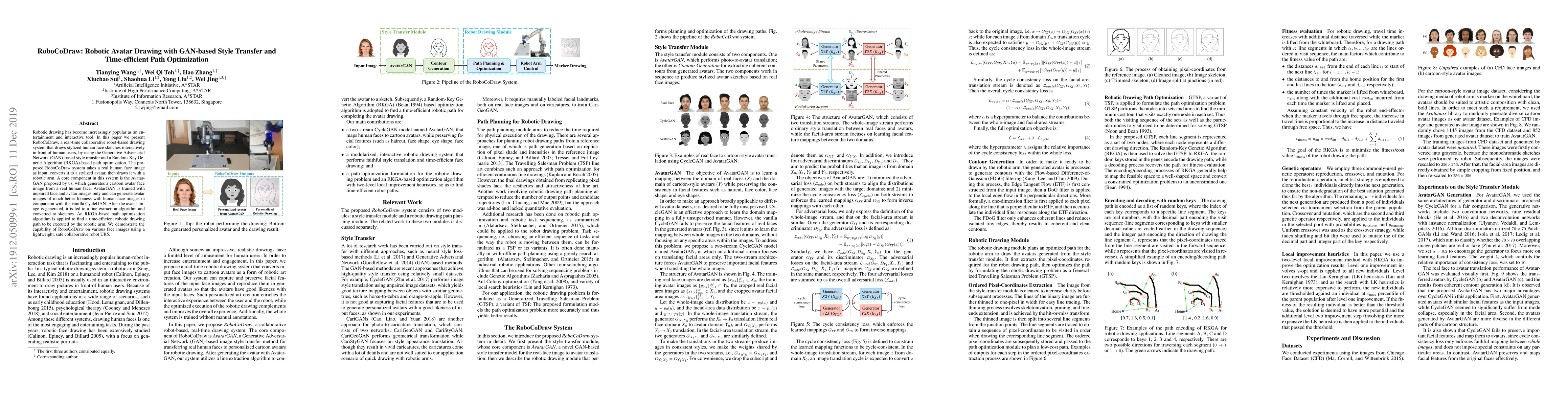 The paper presents AvatarGAN, a two-stream CycleGAN model for generating high-quality cartoon avatars, and an RKGA-based path optimization method for time-efficient robotic drawing.