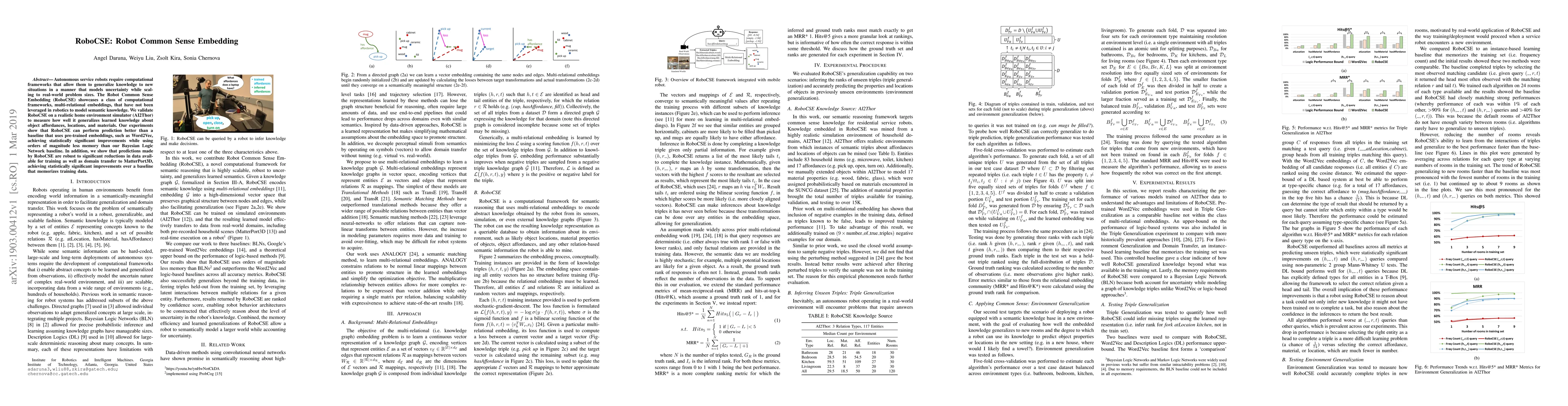RoboCSE introduces a novel computational framework using multi-relational embeddings to model semantic knowledge for autonomous service robots, demonstrating superior generalization and memory efficiency compared to baselines. Experiments in AI2Thor and MatterPort3D show significant improvements in prediction accuracy and robustness to data scarcity.