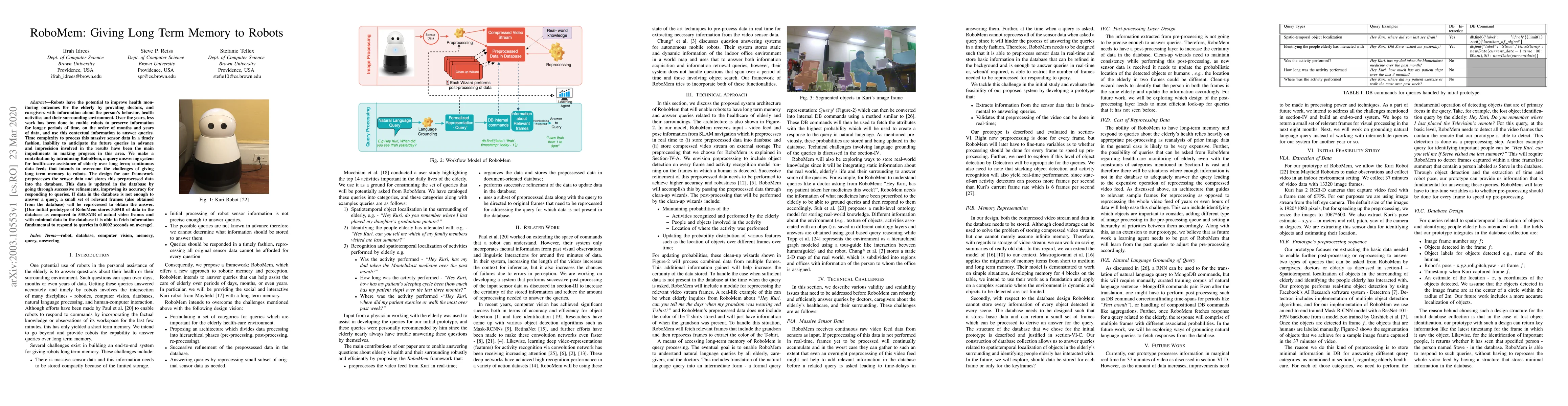 Robots have the potential to improve health monitoring outcomes for the elderly by providing doctors, and caregivers with information about the person's behavior, health activities and their surrounding environment. Over the years, less work has been done to enable robots to preserve information for longer periods of time, on the order of months and years of data, and use this contextual information to answer queries. Time complexity to process this massive sensor data in a timely fashion, inability to anticipate the future queries in advance and imprecision involved in the results have been the main impediments in making progress in this area. We make a contribution by introducing RoboMem, a query answering system for health-care assistance of elderly over long term; continuous data feeds that intends to overcome the challenges of giving long term memory to robots. The design for our framework preprocesses the sensor data and stores this preprocessed data into the database. This data is updated in the database by going through successive refinements, improving its accuracy for responding to queries. If data in the database is not enough to answer a query, a small set of relevant frames (also obtained from the database) will be reprocessed to obtain the answer. [Our initial prototype of RoboMem stores 3.5MB of data in the database as compared to 535.8MB of actual video frames and with minimal data in the database it is able to fetch information fundamental to respond to queries in 0.0002 seconds on average].
