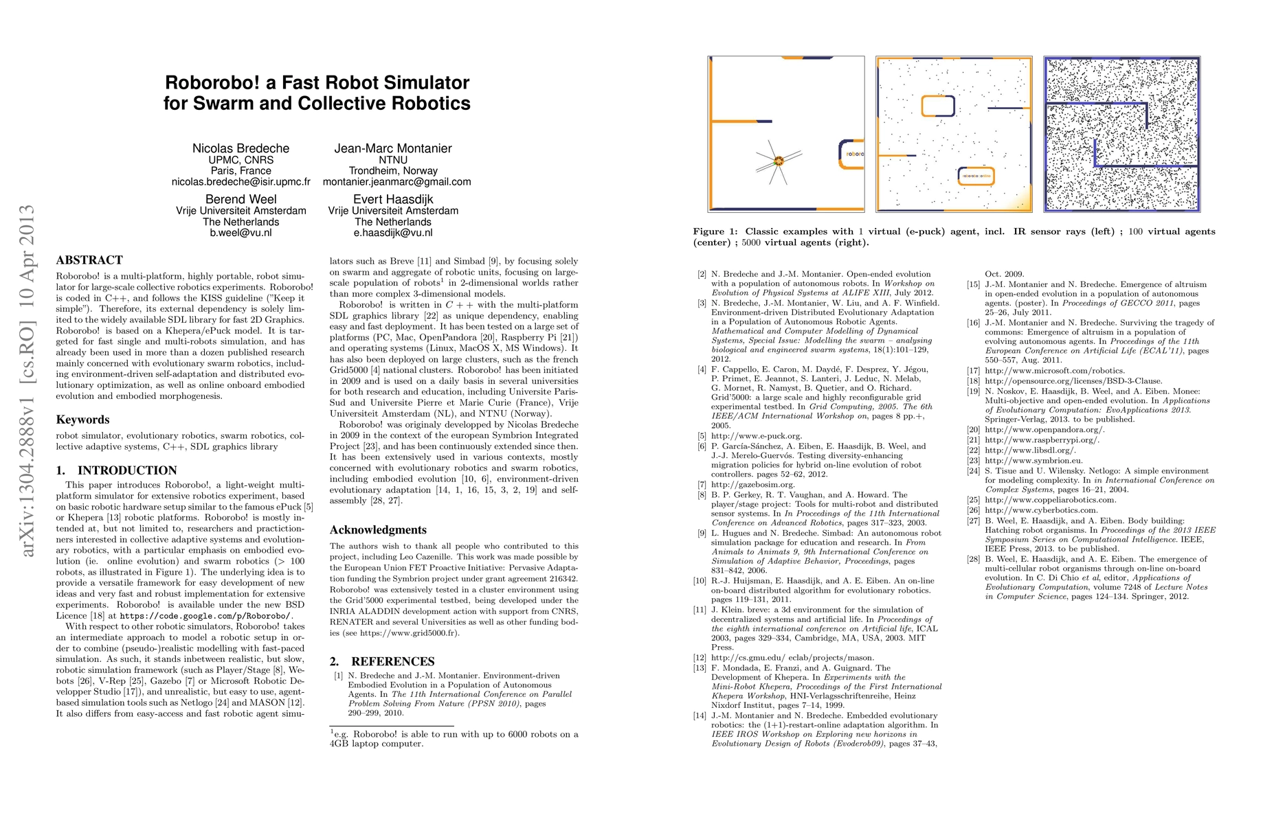 Roborobo! is a lightweight C++ robot simulator for large-scale swarm and collective robotics experiments, relying solely on the SDL library for graphics. It has been utilized in numerous research projects focusing on evolutionary swarm robotics, including self-adaptation and optimization.