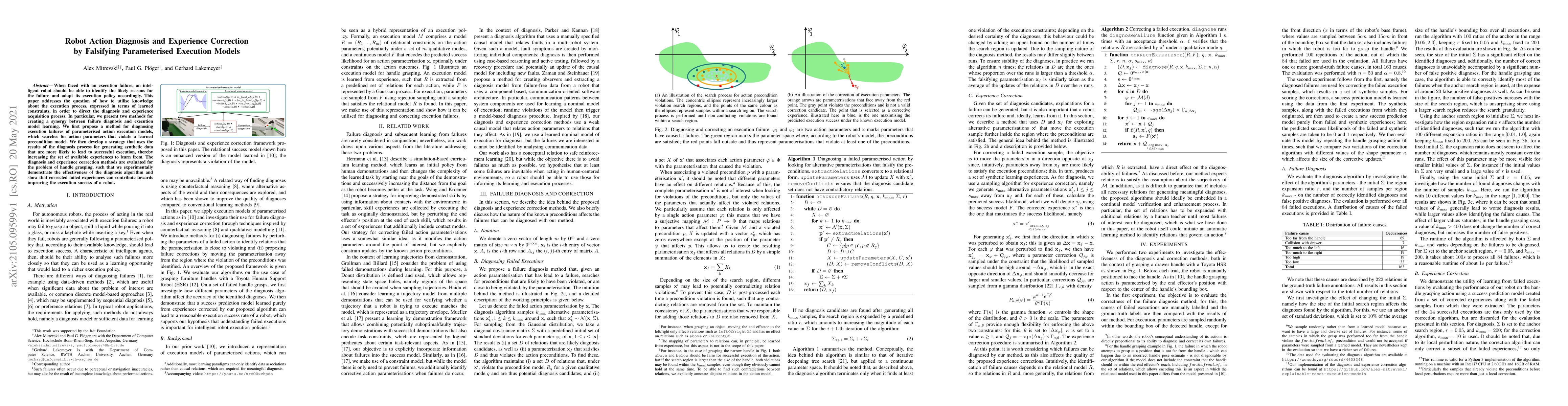 This paper proposes methods for diagnosing execution failures in robots by identifying violated preconditions in parameterised action models and uses the diagnosis results to generate synthetic data for improved execution learning. The effectiveness of the diagnosis and experience correction is demonstrated through handle grasping experiments.