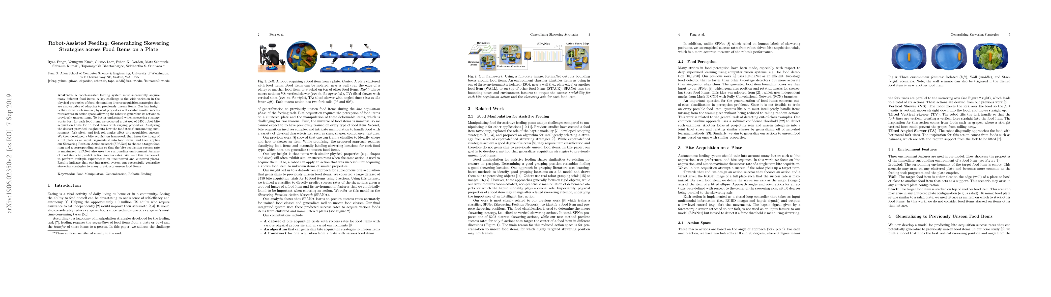 A robot-assisted feeding system must successfully acquire many different food items. A key challenge is the wide variation in the physical properties of food, demanding diverse acquisition strategies that are also capable of adapting to previously unseen items. Our key insight is that items with similar physical properties will exhibit similar success rates across an action space, allowing the robot to generalize its actions to previously unseen items. To better understand which skewering strategy works best for each food item, we collected a dataset of 2450 robot bite acquisition trials for 16 food items with varying properties. Analyzing the dataset provided insights into how the food items' surrounding environment, fork pitch, and fork roll angles affect bite acquisition success. We then developed a bite acquisition framework that takes the image of a full plate as an input, segments it into food items, and then applies our Skewering-Position-Action network (SPANet) to choose a target food item and a corresponding action so that the bite acquisition success rate is maximized. SPANet also uses the surrounding environment features of food items to predict action success rates. We used this framework to perform multiple experiments on uncluttered and cluttered plates. Results indicate that our integrated system can successfully generalize skewering strategies to many previously unseen food items.