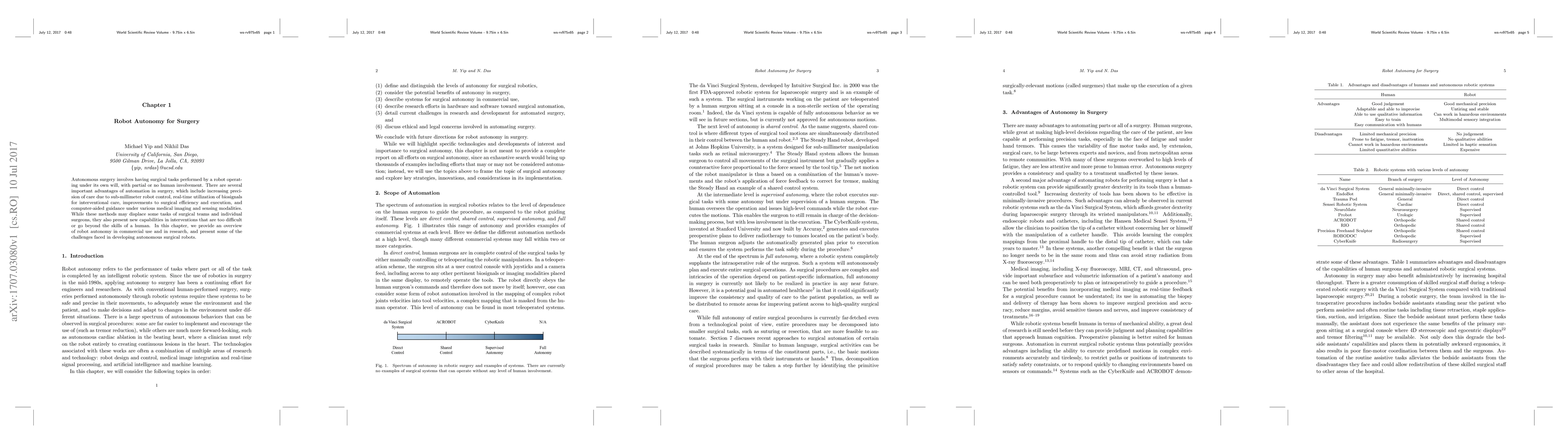 Autonomous surgery involves having surgical tasks performed by a robot operating under its own will, with partial or no human involvement. There are several important advantages of automation in surgery, which include increasing precision of care due to sub-millimeter robot control, real-time utilization of biosignals for interventional care, improvements to surgical efficiency and execution, and computer-aided guidance under various medical imaging and sensing modalities. While these methods may displace some tasks of surgical teams and individual surgeons, they also present new capabilities in interventions that are too difficult or go beyond the skills of a human. In this chapter, we provide an overview of robot autonomy in commercial use and in research, and present some of the challenges faced in developing autonomous surgical robots.