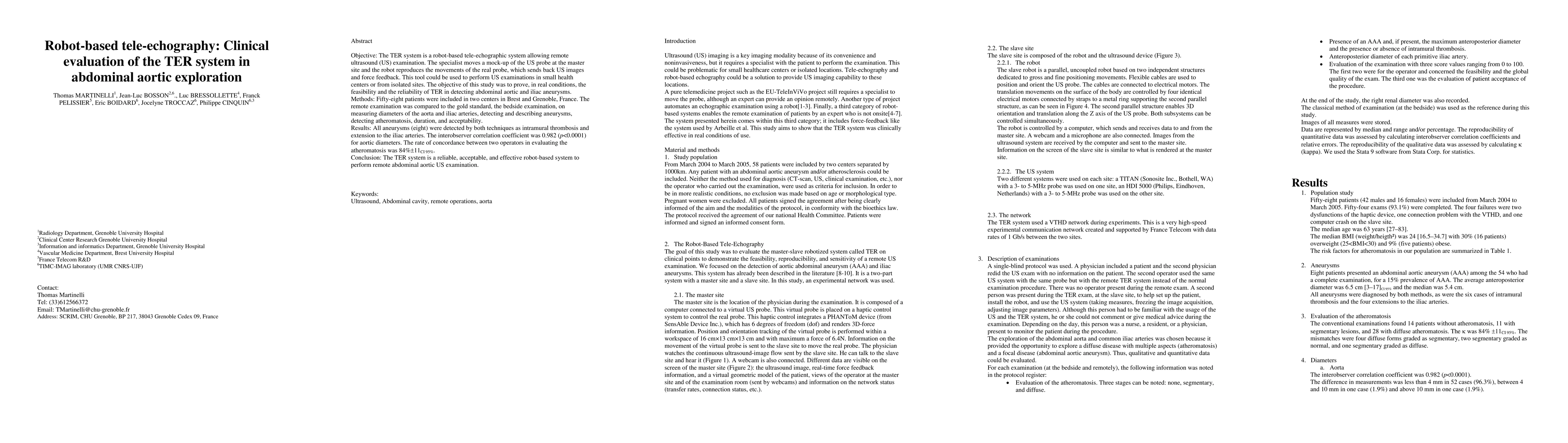 This study evaluates the TER robot-based tele-echography system for remote abdominal aortic ultrasound examinations, demonstrating high reliability and accuracy in detecting aneurysms and atheromatosis. The system shows promise for use in remote or small healthcare centers.