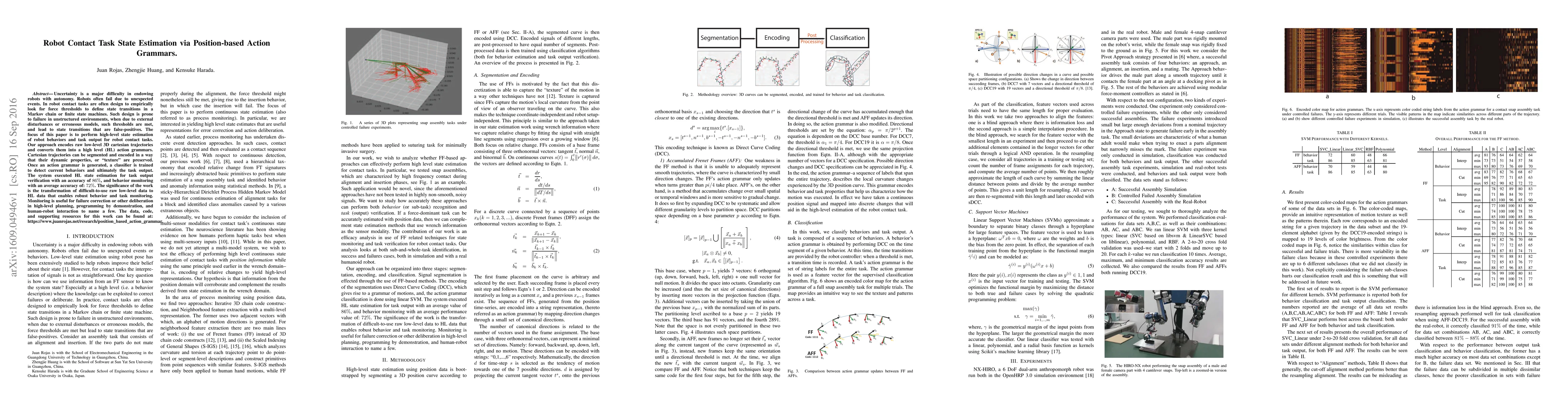 Uncertainty is a major difficulty in endowing robots with autonomy. Robots often fail due to unexpected events. In robot contact tasks are often design to empirically look for force thresholds to define state transitions in a Markov chain or finite state machines. Such design is prone to failure in unstructured environments, when due to external disturbances or erroneous models, such thresholds are met, and lead to state transitions that are false-positives. The focus of this paper is to perform high-level state estimation of robot behaviors and task output for robot contact tasks. Our approach encodes raw low-level 3D cartesian trajectories and converts them into a high level (HL) action grammars. Cartesian trajectories can be segmented and encoded in a way that their dynamic properties, or "texture" are preserved. Once an action grammar is generated, a classifier is trained to detect current behaviors and ultimately the task output. The system executed HL state estimation for task output verification with an accuracy of 86%, and behavior monitoring with an average accuracy of: 72%. The significance of the work is the transformation of difficult-to-use raw low-level data to HL data that enables robust behavior and task monitoring. Monitoring is useful for failure correction or other deliberation in high-level planning, programming by demonstration, and human-robot interaction to name a few.