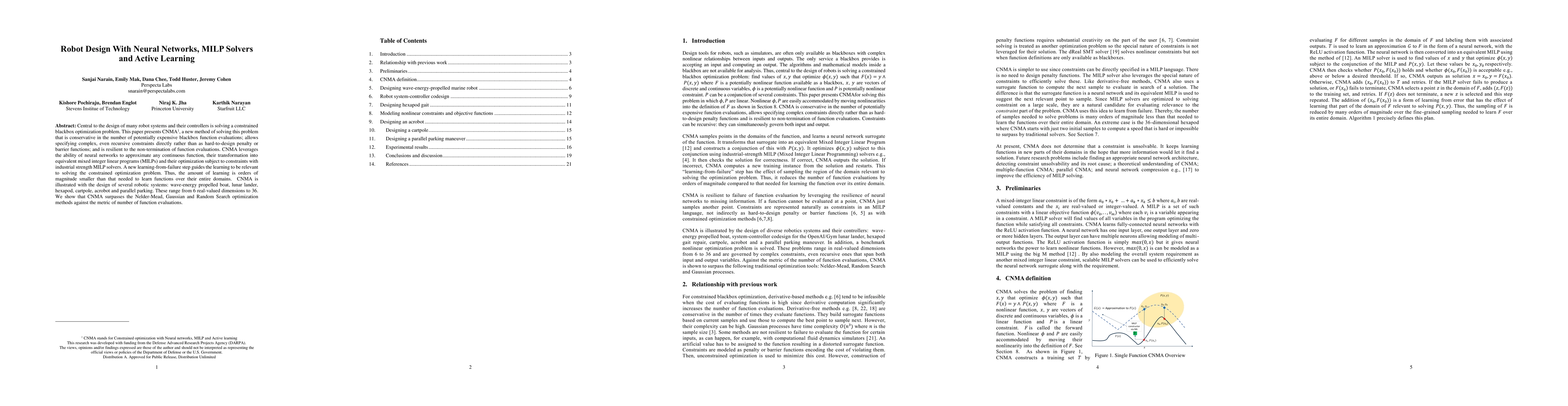 This paper introduces CNMA, a novel method for robot design that combines neural networks, mixed integer linear programming (MILP) solvers, and active learning to efficiently solve constrained blackbox optimization problems with fewer evaluations. CNMA demonstrates superior performance over traditional optimization methods in designing various robotic systems.