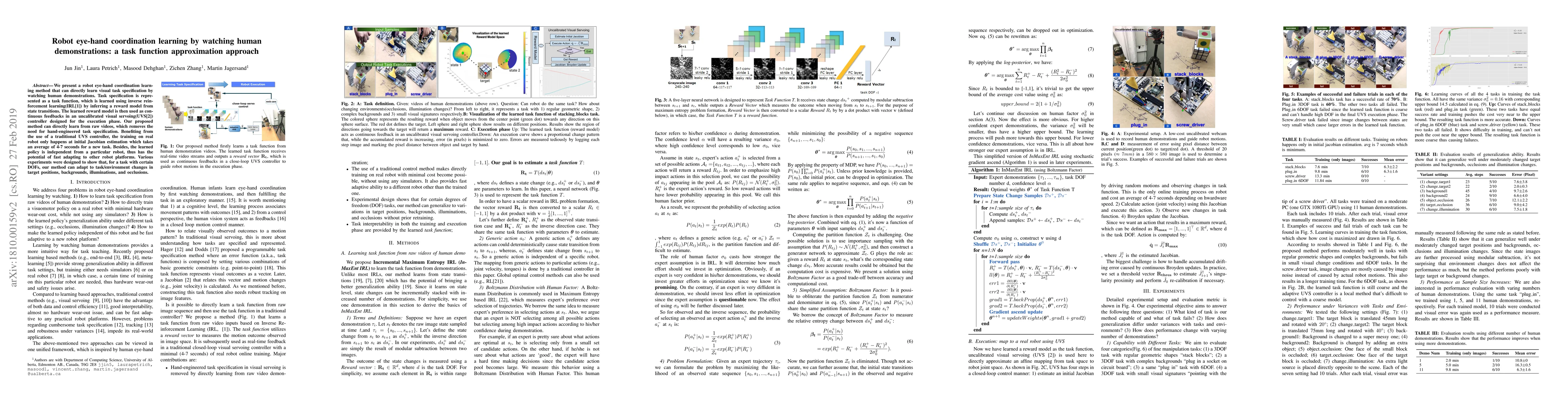 This paper proposes a method for robot eye-hand coordination learning through human demonstrations, using inverse reinforcement learning to infer task functions from raw videos. The learned task function serves as feedback in an uncalibrated visual servoing controller, enabling efficient adaptation to task/environment variances without prior retraining.