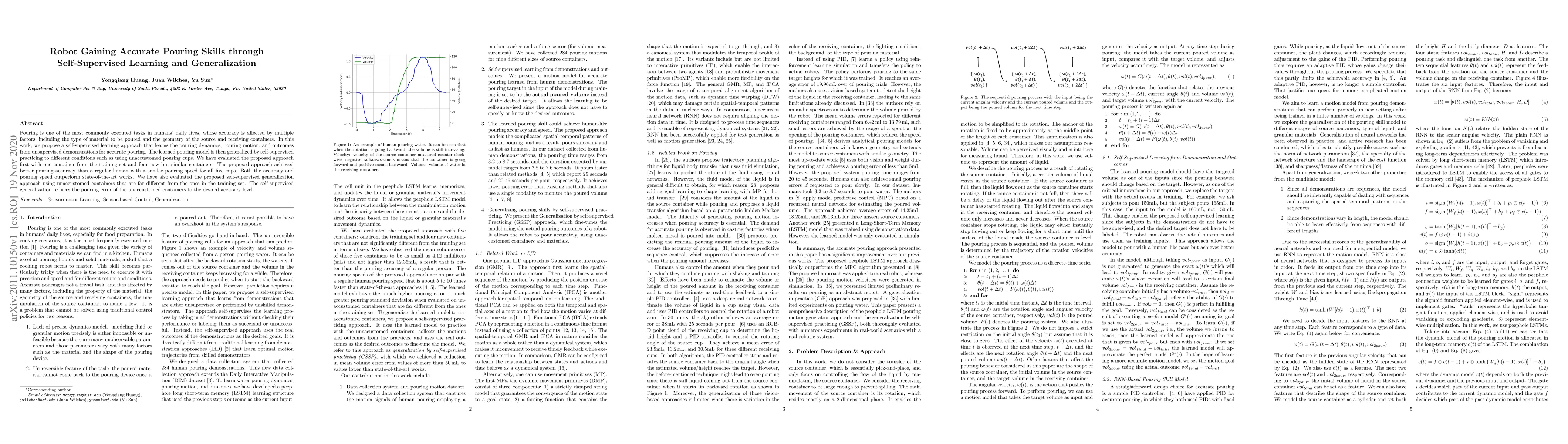 A robot learns to pour accurately through self-supervised learning, outperforming human accuracy and speed in similar tasks, with improved performance on unfamiliar containers.
