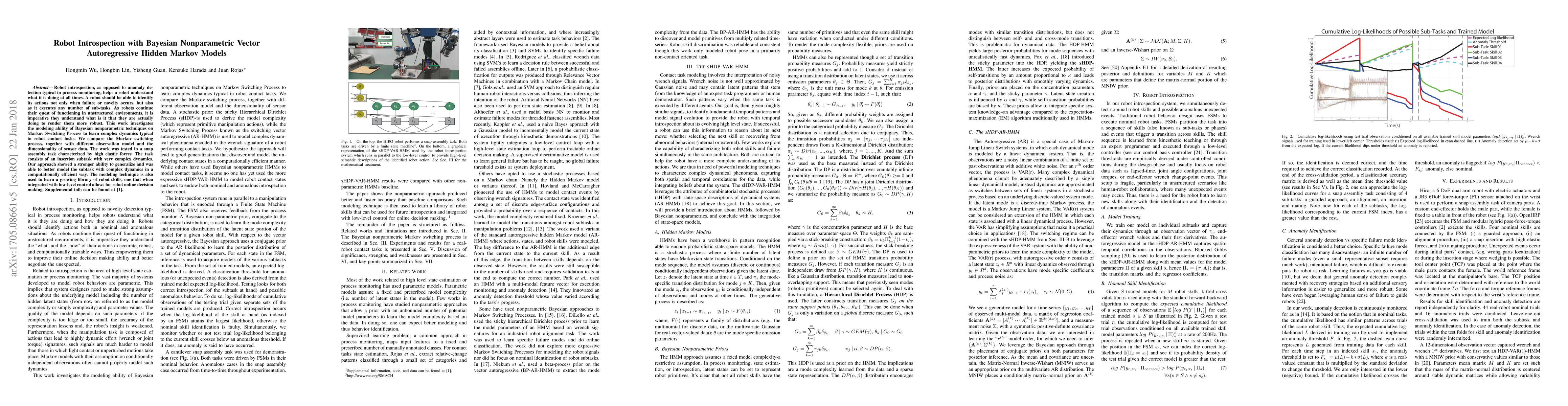 Robot introspection, as opposed to anomaly detection typical in process monitoring, helps a robot understand what it is doing at all times. A robot should be able to identify its actions not only when failure or novelty occurs, but also as it executes any number of sub-tasks. As robots continue their quest of functioning in unstructured environments, it is imperative they understand what is it that they are actually doing to render them more robust. This work investigates the modeling ability of Bayesian nonparametric techniques on Markov Switching Process to learn complex dynamics typical in robot contact tasks. We study whether the Markov switching process, together with Bayesian priors can outperform the modeling ability of its counterparts: an HMM with Bayesian priors and without. The work was tested in a snap assembly task characterized by high elastic forces. The task consists of an insertion subtask with very complex dynamics. Our approach showed a stronger ability to generalize and was able to better model the subtask with complex dynamics in a computationally efficient way. The modeling technique is also used to learn a growing library of robot skills, one that when integrated with low-level control allows for robot online decision making.