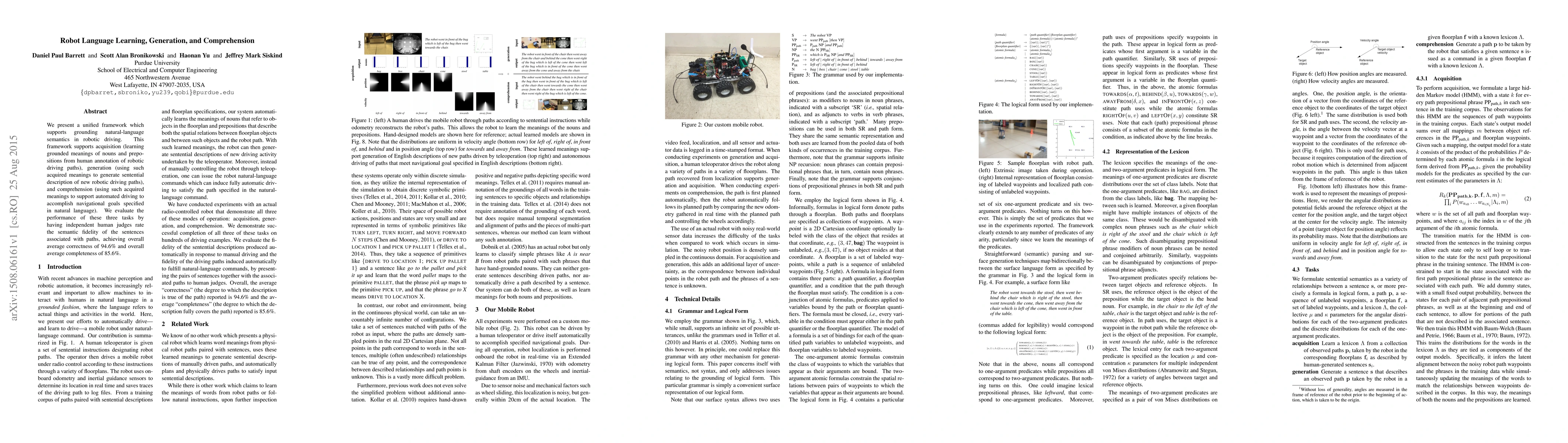 This paper introduces a framework enabling robots to learn, generate, and understand natural language for driving tasks. Through human annotation of driving paths, the robot learns language meanings, then uses these to describe new paths and follow natural language navigation instructions, achieving high human judge accuracy of 94.6% for semantic fidelity and 85.6% for completeness.