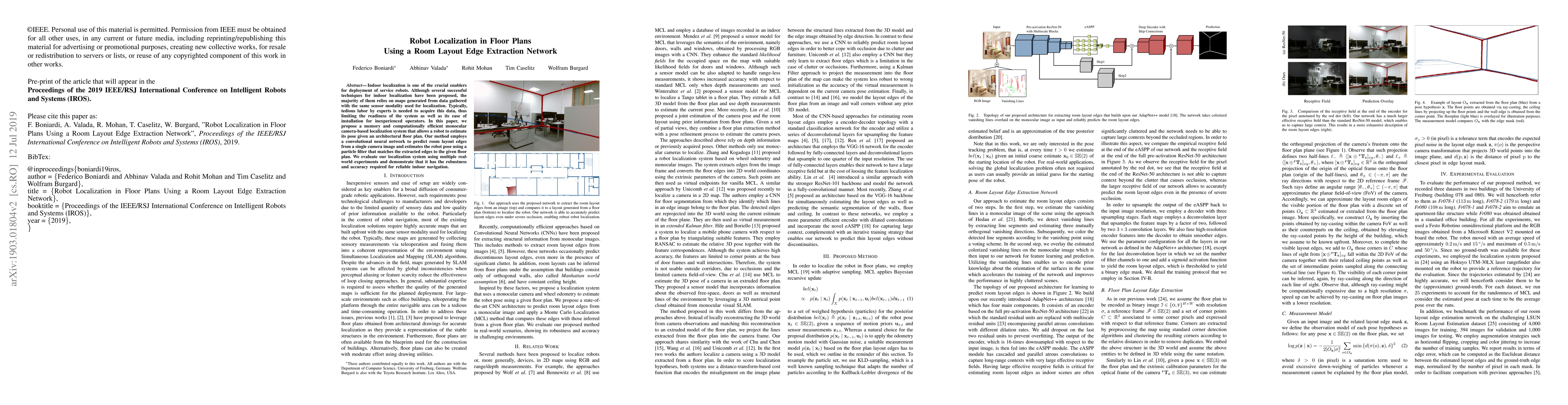 This paper proposes a monocular camera-based localization system for indoor robots using a convolutional neural network to extract room layout edges from single images, and a particle filter to match these edges to architectural floor plans for pose estimation. Experiments show the system's robustness and accuracy for reliable indoor navigation.