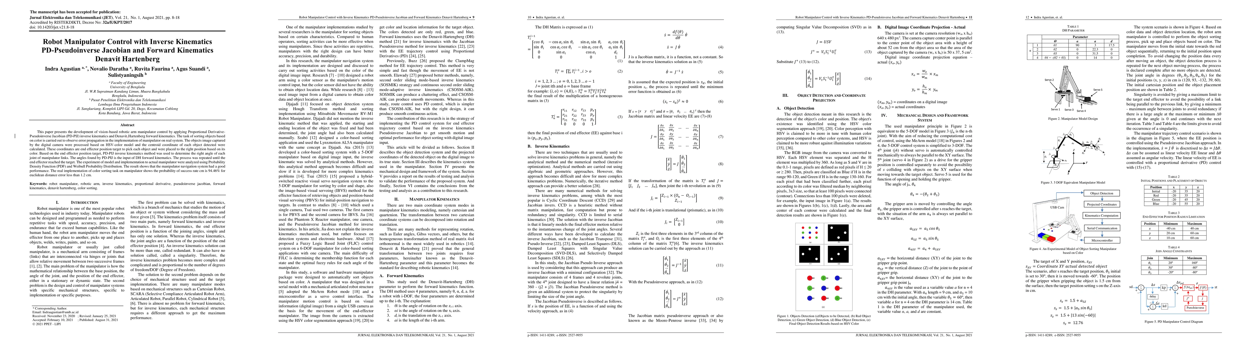 This paper develops a vision-based robotic arm manipulator control using PD-PIJ inverse kinematics and Denavit Hartenberg forward kinematics for color-based object sorting. Experiments show a 94.46% success rate for errors under 1.2 cm.