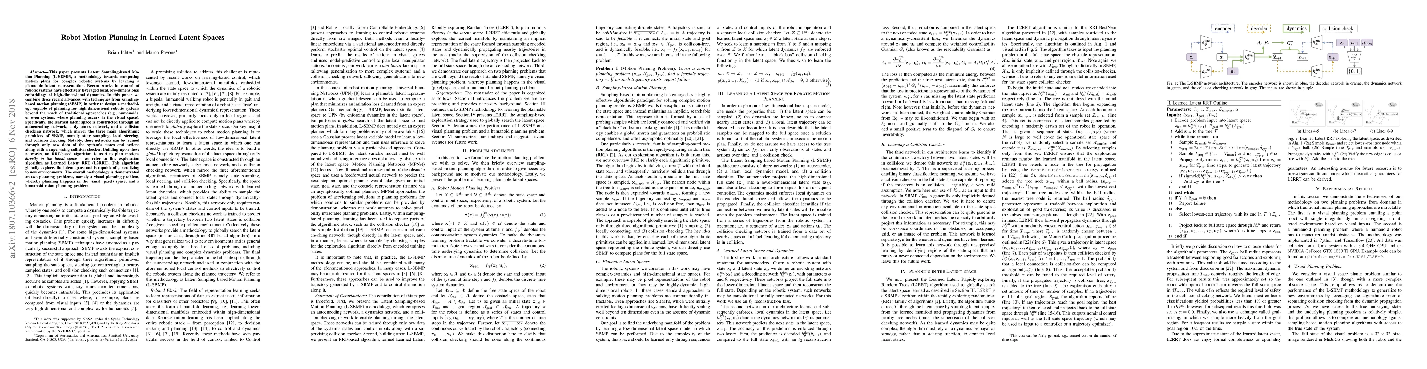 This paper introduces Latent Sampling-based Motion Planning (L-SBMP), a novel methodology for planning motions in high-dimensional robotic systems by learning a latent representation. It combines autoencoding networks with sampling-based motion planning to create a Learned Latent RRT (L2RRT) algorithm that can generalize to new environments, demonstrated through visual planning and humanoid robot planning.