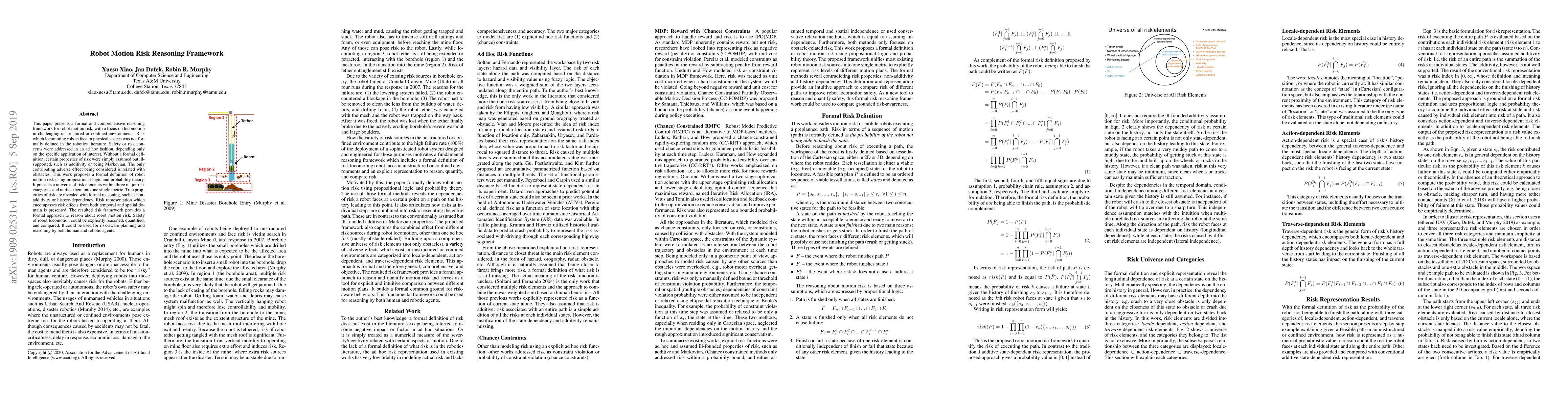 This paper presents a formal and comprehensive reasoning framework for robot motion risk, with a focus on locomotion in challenging unstructured or confined environments. Risk which locomoting robots face in physical spaces was not formally defined in the robotics literature. Safety or risk concerns were addressed in an ad hoc fashion, depending only on the specific application of interest. Without a formal definition, certain properties of risk were simply assumed but ill-supported, such as additivity or being Markovian. The only contributing adverse effect being considered is related with obstacles. This work proposes a formal definition of robot motion risk using propositional logic and probability theory. It presents a universe of risk elements within three major risk categories and unifies them into one single metric. True properties of risk are revealed with formal reasoning, such as non-additivity or history-dependency. Risk representation which encompasses risk effects from both temporal and spatial domain is presented. The resulted risk framework provides a formal approach to reason about robot motion risk. Safety of robot locomotion could be explicitly reasoned, quantified, and compared. It could be used for risk-aware planning and reasoning by both human and robotic agents.
