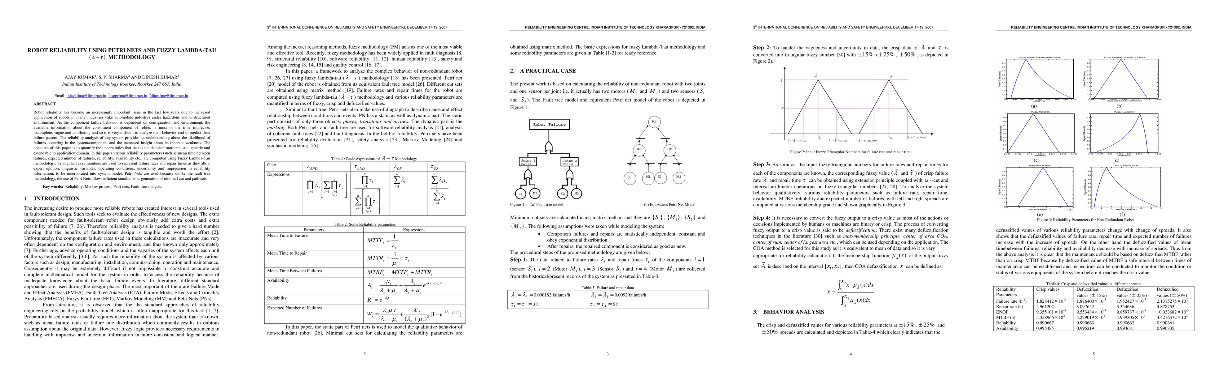 This paper proposes a method to quantify the uncertainties in robot reliability using the Fuzzy Lambda-Tau methodology and Petri Nets. It computes reliability parameters like mean time between failures and availability, incorporating imprecision and expert opinion through triangular fuzzy numbers.