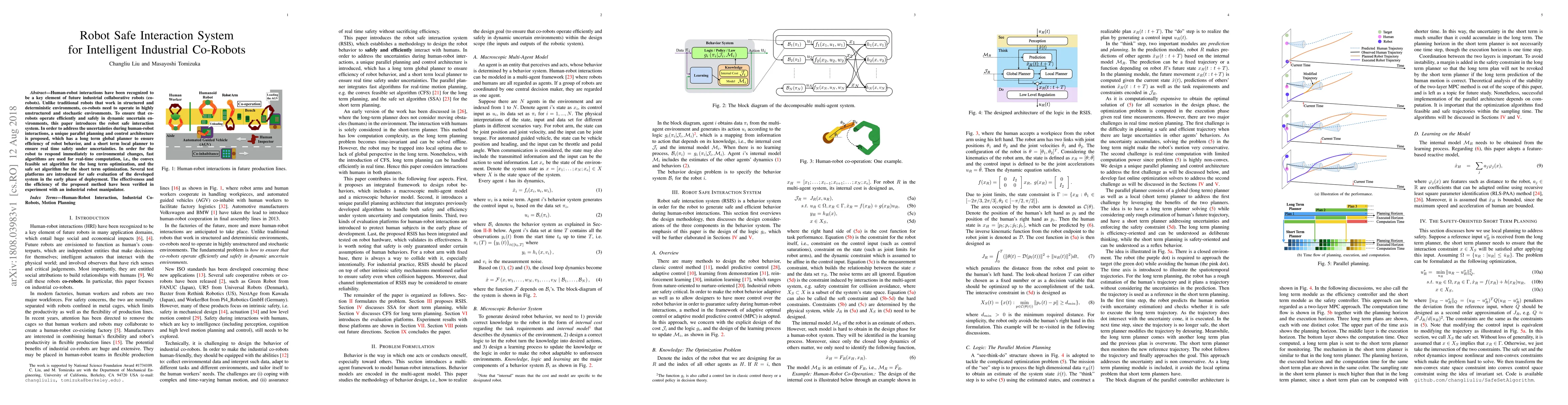 This paper proposes a robot safe interaction system for intelligent industrial co-robots operating in unstructured environments, featuring a parallel planning and control architecture with global and local planners for efficiency and real-time safety. Experiments with an industrial robot manipulator demonstrate the effectiveness and efficiency of the system.