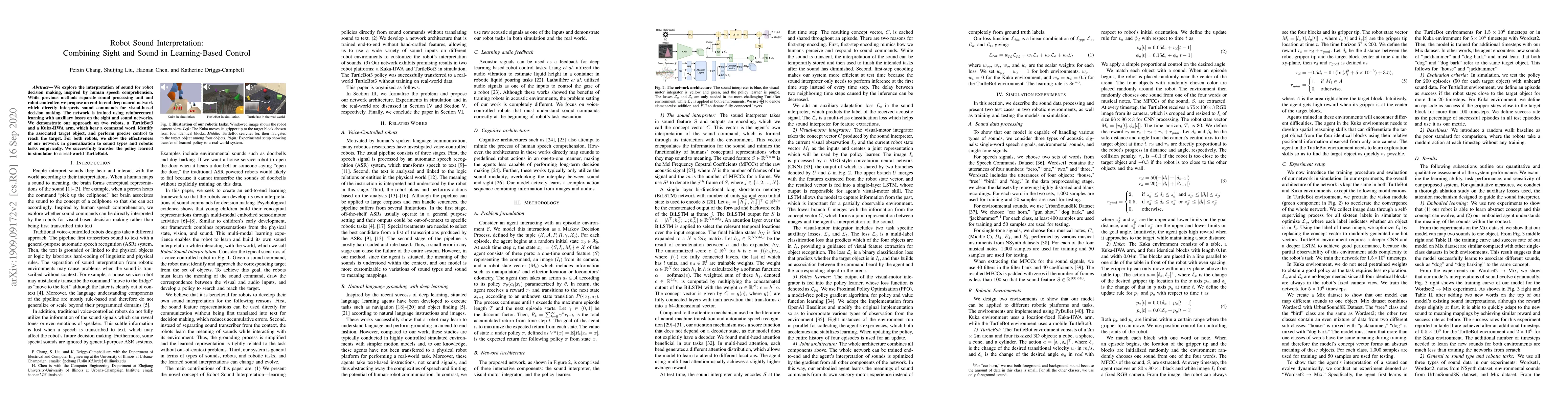 The paper proposes an end-to-end deep neural network that directly interprets sound commands for visual-based decision making in robots, trained using reinforcement learning with auxiliary losses on sight and sound networks.