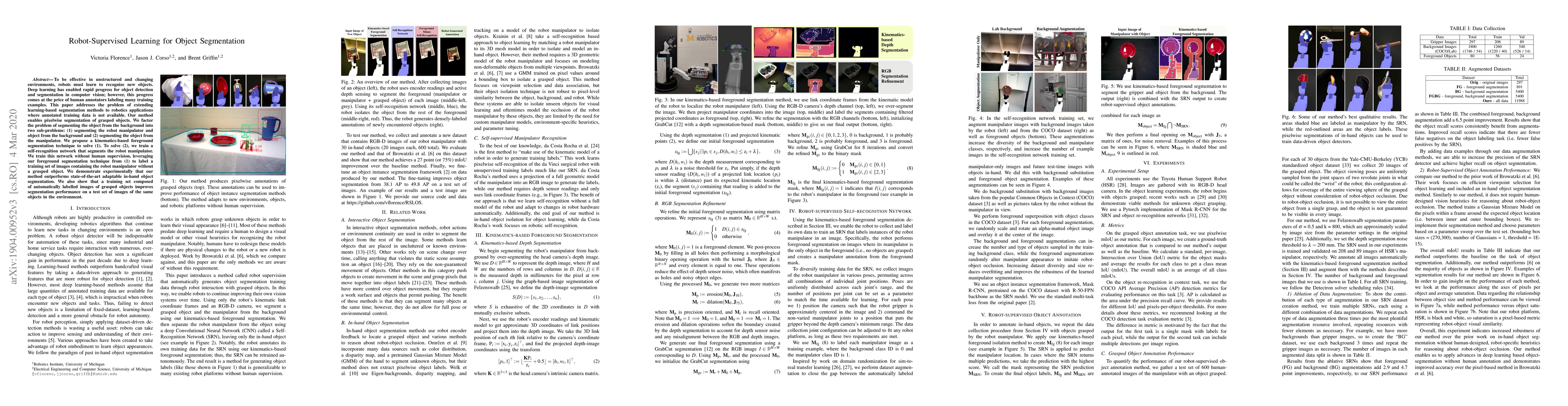 This research introduces a robot-based method for teaching object segmentation without human labels, using a two-step process to distinguish objects from backgrounds and the robot itself. The approach enables robots to automatically learn to identify grasped objects, improving performance in unstructured environments.