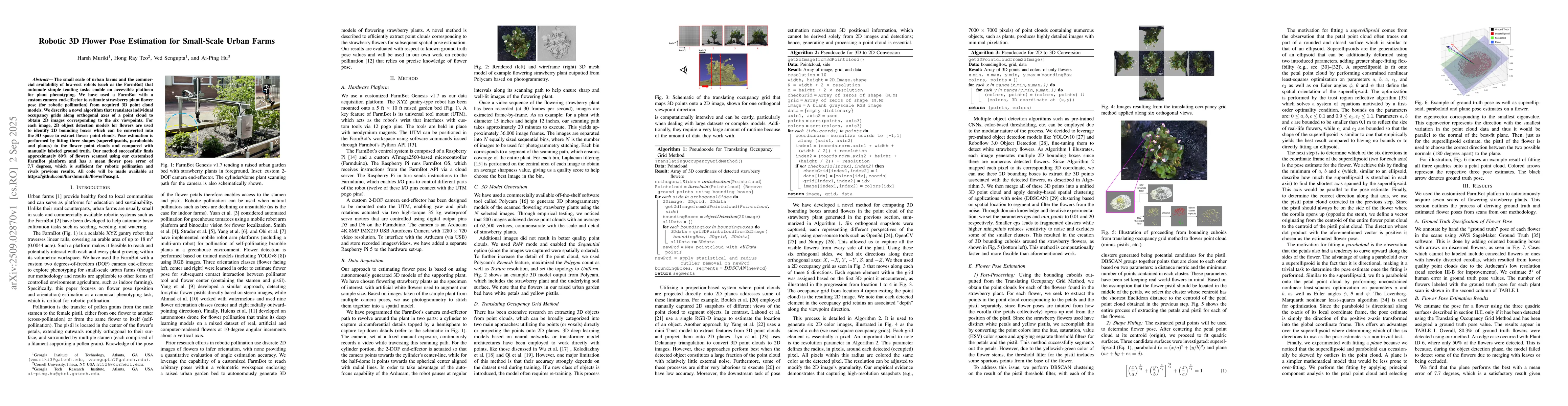 The small scale of urban farms and the commercial availability of low-cost robots (such as the FarmBot) that automate simple tending tasks enable an accessible platform for plant phenotyping. We have used a FarmBot with a custom camera end-effector to estimate strawberry plant flower pose (for robotic pollination) from acquired 3D point cloud models. We describe a novel algorithm that translates individual occupancy grids along orthogonal axes of a point cloud to obtain 2D images corresponding to the six viewpoints. For each image, 2D object detection models for flowers are used to identify 2D bounding boxes which can be converted into the 3D space to extract flower point clouds. Pose estimation is performed by fitting three shapes (superellipsoids, paraboloids and planes) to the flower point clouds and compared with manually labeled ground truth. Our method successfully finds approximately 80% of flowers scanned using our customized FarmBot platform and has a mean flower pose error of 7.7 degrees, which is sufficient for robotic pollination and rivals previous results. All code will be made available at https://github.com/harshmuriki/flowerPose.git.