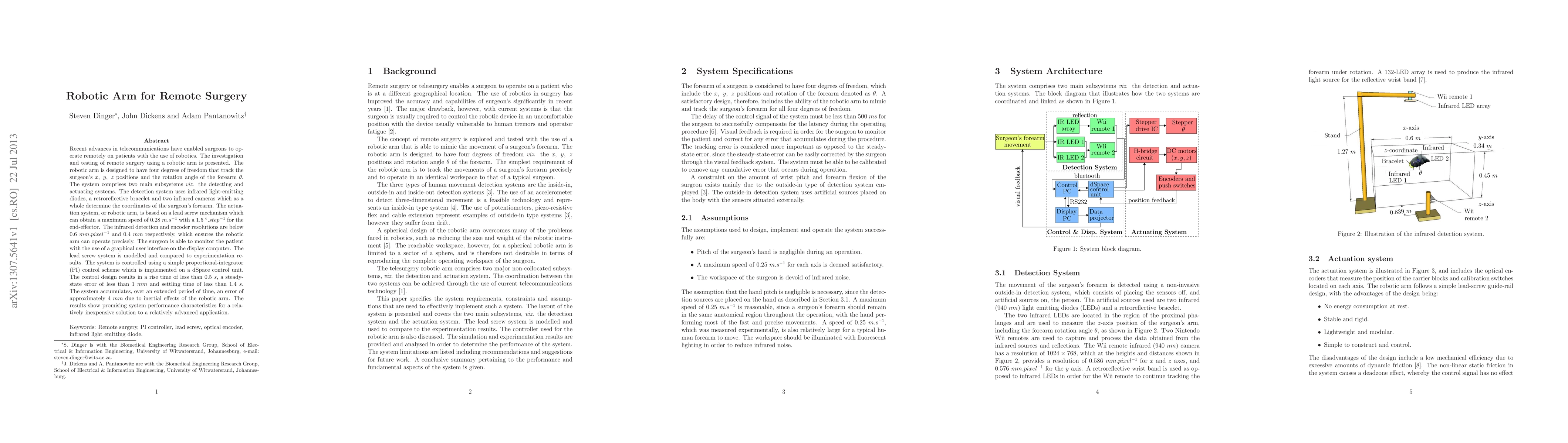This paper investigates a robotic arm designed for remote surgery, featuring four degrees of freedom and precise tracking of the surgeon's forearm. The system employs infrared detection and a lead screw mechanism, achieving a rise time of less than 0.5 s and a steady-state error of less than 1 mm, demonstrating potential for remote surgical applications.