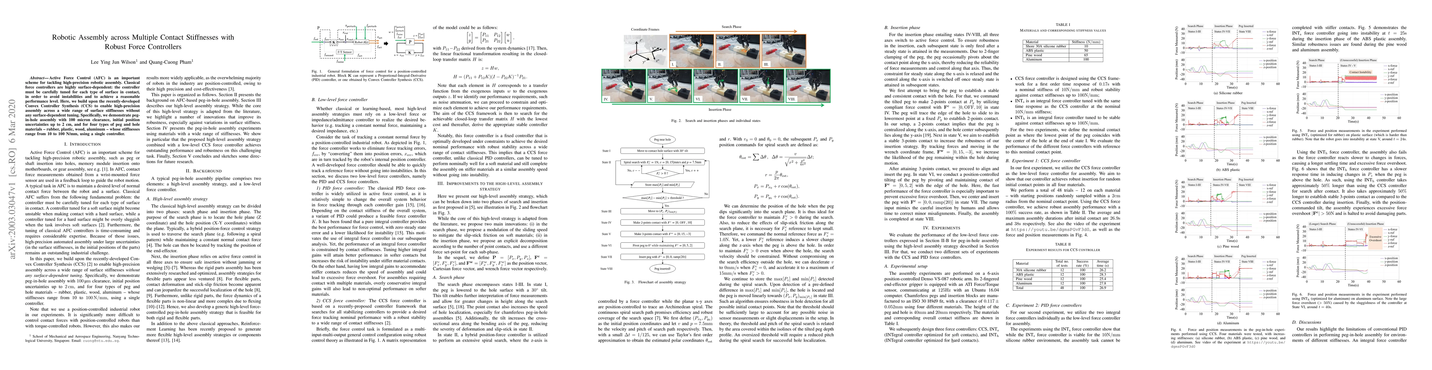 Active Force Control (AFC) is an important scheme for tackling high-precision robotic assembly. Classical force controllers are highly surface-dependent: the controller must be carefully tuned for each type of surface in contact, in order to avoid instabilities and to achieve a reasonable performance level. Here, we build upon the recently-developed Convex Controller Synthesis (CCS) to enable high-precision assembly across a wide range of surface stiffnesses without any surface-dependent tuning. Specifically, we demonstrate peg-in-hole assembly with 100 micron clearance, initial position uncertainties up to 2 cm, and for four types of peg and hole materials -- rubber, plastic, wood, aluminum -- whose stiffnesses range from 10 to 100 N/mm, using a single controller.