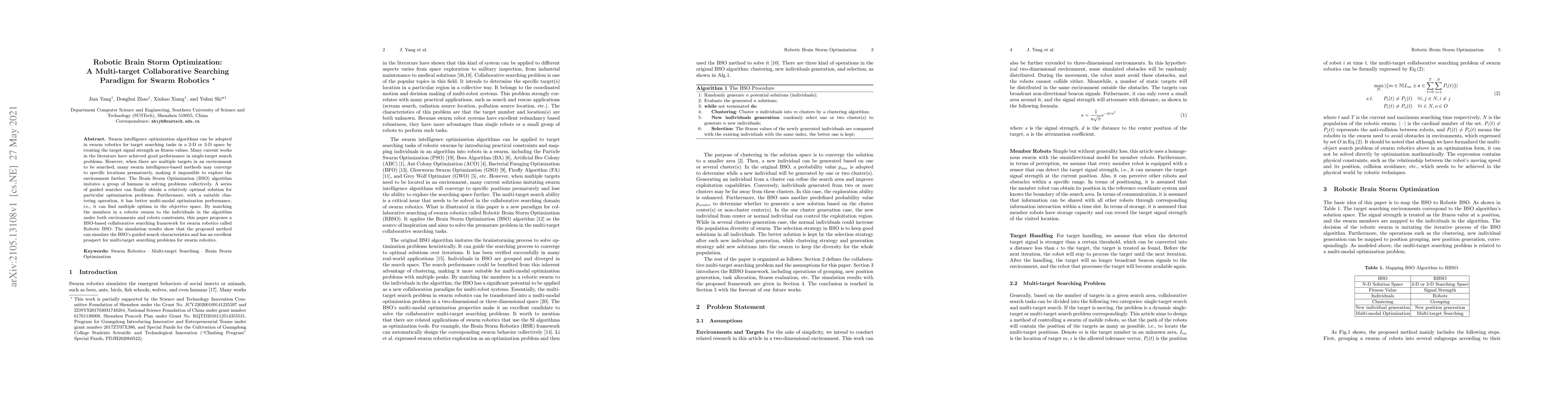 Swarm intelligence optimization algorithms can be adopted in swarm robotics for target searching tasks in a 2-D or 3-D space by treating the target signal strength as fitness values. Many current works in the literature have achieved good performance in single-target search problems. However, when there are multiple targets in an environment to be searched, many swarm intelligence-based methods may converge to specific locations prematurely, making it impossible to explore the environment further. The Brain Storm Optimization (BSO) algorithm imitates a group of humans in solving problems collectively. A series of guided searches can finally obtain a relatively optimal solution for particular optimization problems. Furthermore, with a suitable clustering operation, it has better multi-modal optimization performance, i.e., it can find multiple optima in the objective space. By matching the members in a robotic swarm to the individuals in the algorithm under both environments and robots constraints, this paper proposes a BSO-based collaborative searching framework for swarm robotics called Robotic BSO. The simulation results show that the proposed method can simulate the BSO's guided search characteristics and has an excellent prospect for multi-target searching problems for swarm robotics.