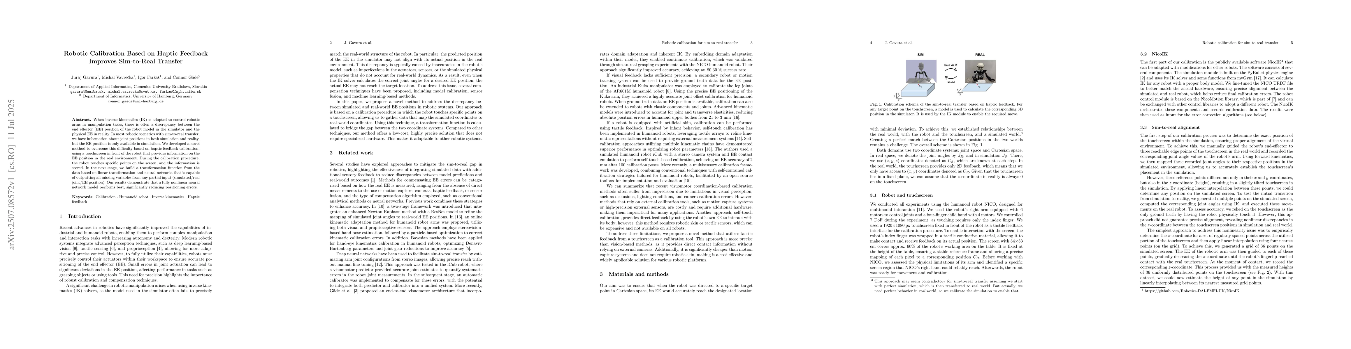 When inverse kinematics (IK) is adopted to control robotic arms in manipulation tasks, there is often a discrepancy between the end effector (EE) position of the robot model in the simulator and the physical EE in reality. In most robotic scenarios with sim-to-real transfer, we have information about joint positions in both simulation and reality, but the EE position is only available in simulation. We developed a novel method to overcome this difficulty based on haptic feedback calibration, using a touchscreen in front of the robot that provides information on the EE position in the real environment. During the calibration procedure, the robot touches specific points on the screen, and the information is stored. In the next stage, we build a transformation function from the data based on linear transformation and neural networks that is capable of outputting all missing variables from any partial input (simulated/real joint/EE position). Our results demonstrate that a fully nonlinear neural network model performs best, significantly reducing positioning errors.