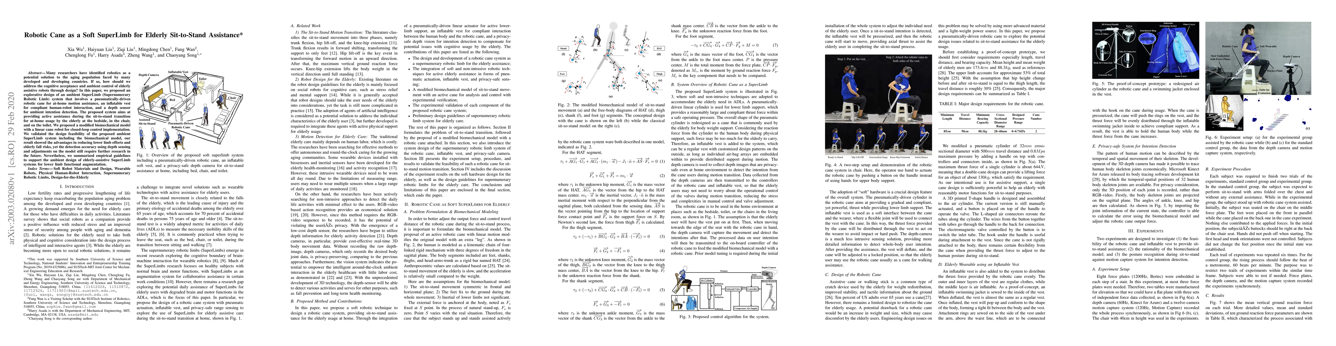 This paper proposes an ambient SuperLimb system featuring a robotic cane, an inflatable vest, and a depth sensor to assist elderly individuals in sit-to-stand transitions at home. The study validates the system's design and demonstrates its potential to reduce lower limb efforts and fall risks, though further research is needed to improve detection accuracy.