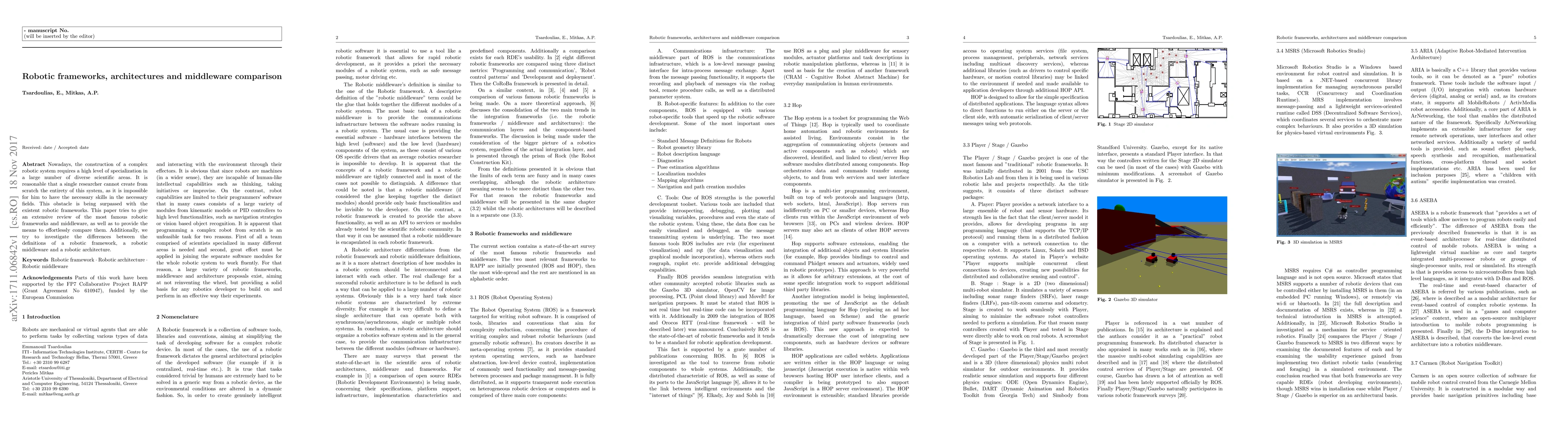 This paper reviews prominent robotic frameworks and middleware, aiming to facilitate their comparison and clarify distinctions between frameworks, middleware, and architectures in robotics. It addresses the challenge of interdisciplinary expertise required for complex robotic systems.
