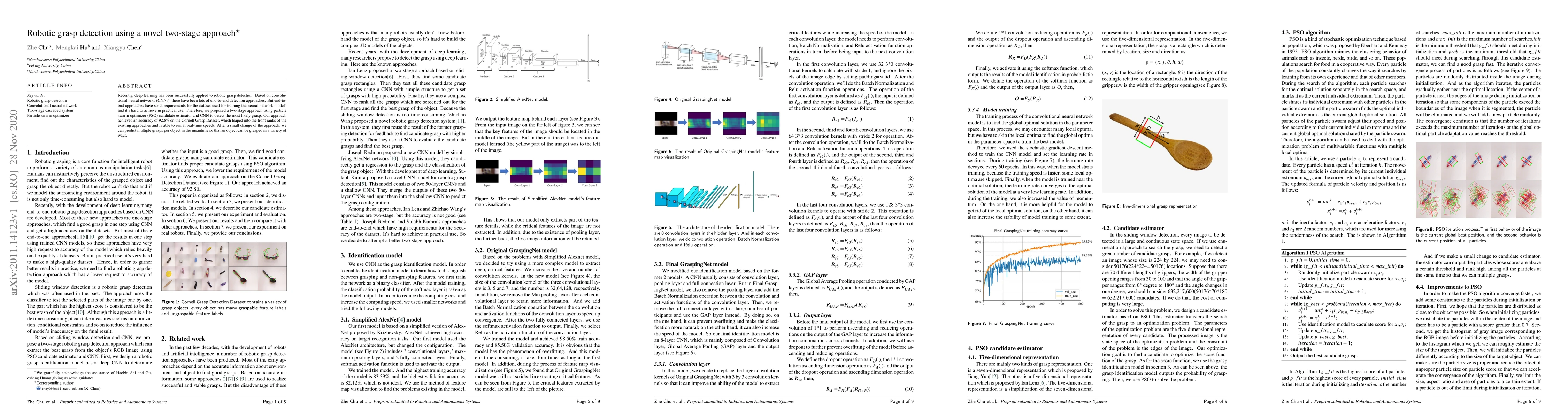 A novel two-stage approach is proposed, combining CNN-based feature learning with PSO optimization for efficient grasp detection.