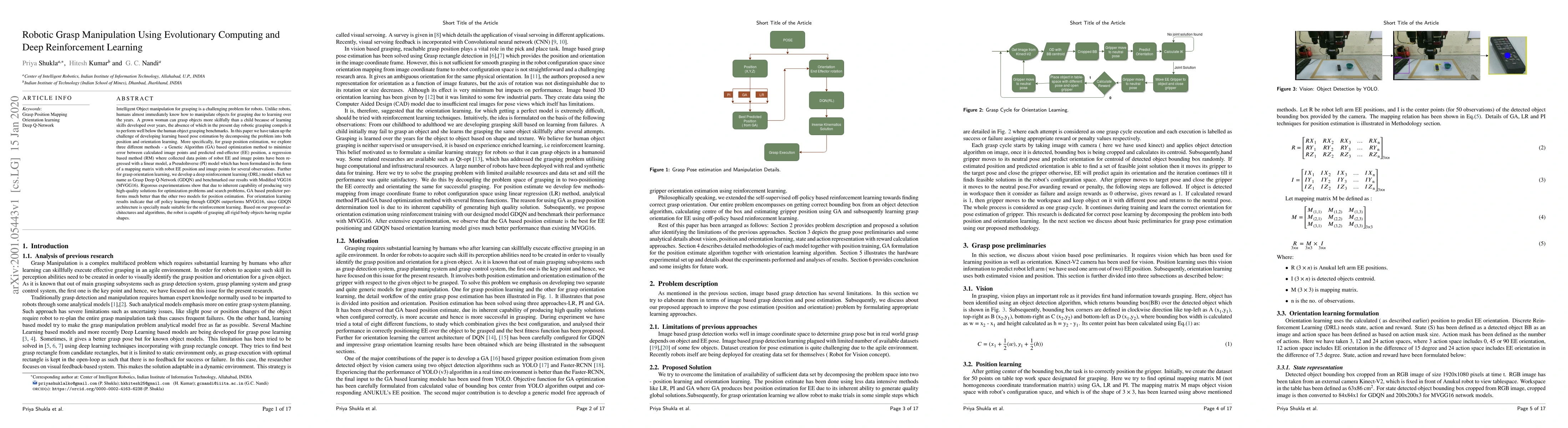 Intelligent Object manipulation for grasping is a challenging problem for robots. Unlike robots, humans almost immediately know how to manipulate objects for grasping due to learning over the years. A grown woman can grasp objects more skilfully than a child because of learning skills developed over years, the absence of which in the present day robotic grasping compels it to perform well below the human object grasping benchmarks. In this paper we have taken up the challenge of developing learning based pose estimation by decomposing the problem into both position and orientation learning. More specifically, for grasp position estimation, we explore three different methods - a Genetic Algorithm (GA) based optimization method to minimize error between calculated image points and predicted end-effector (EE) position, a regression based method (RM) where collected data points of robot EE and image points have been regressed with a linear model, a PseudoInverse (PI) model which has been formulated in the form of a mapping matrix with robot EE position and image points for several observations. Further for grasp orientation learning, we develop a deep reinforcement learning (DRL) model which we name as Grasp Deep Q-Network (GDQN) and benchmarked our results with Modified VGG16 (MVGG16). Rigorous experimentations show that due to inherent capability of producing very high-quality solutions for optimization problems and search problems, GA based predictor performs much better than the other two models for position estimation. For orientation learning results indicate that off policy learning through GDQN outperforms MVGG16, since GDQN architecture is specially made suitable for the reinforcement learning. Based on our proposed architectures and algorithms, the robot is capable of grasping all rigid body objects having regular shapes.