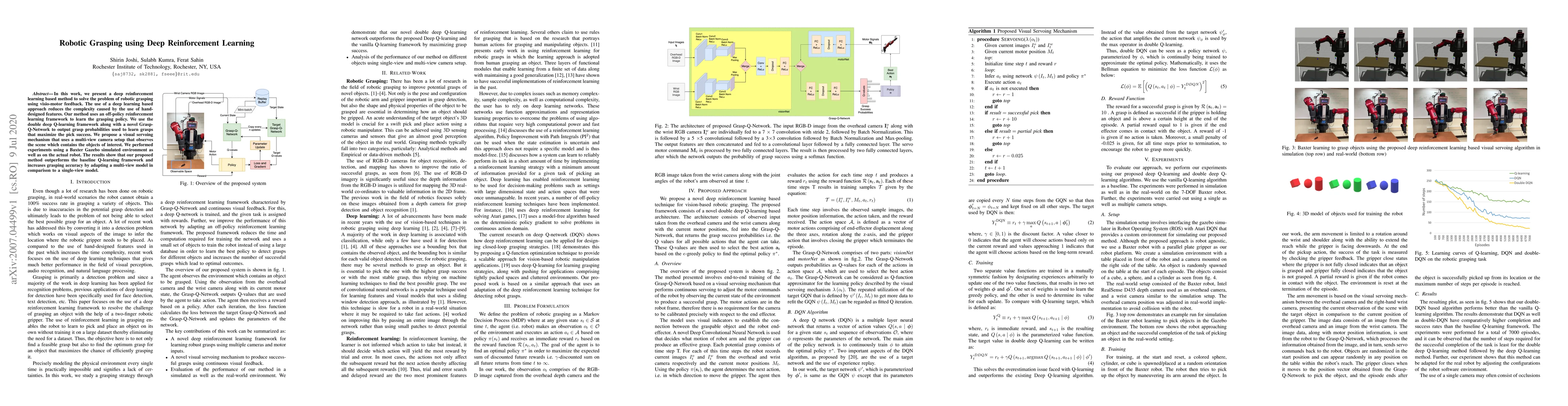 This research introduces a deep reinforcement learning method for robotic grasping using visio-motor feedback, employing double deep Q-learning and a Grasp-Q-Network to maximize pick success. Experiments in simulated and real environments show improved grasping accuracy over baseline methods, particularly with a multi-view camera setup.