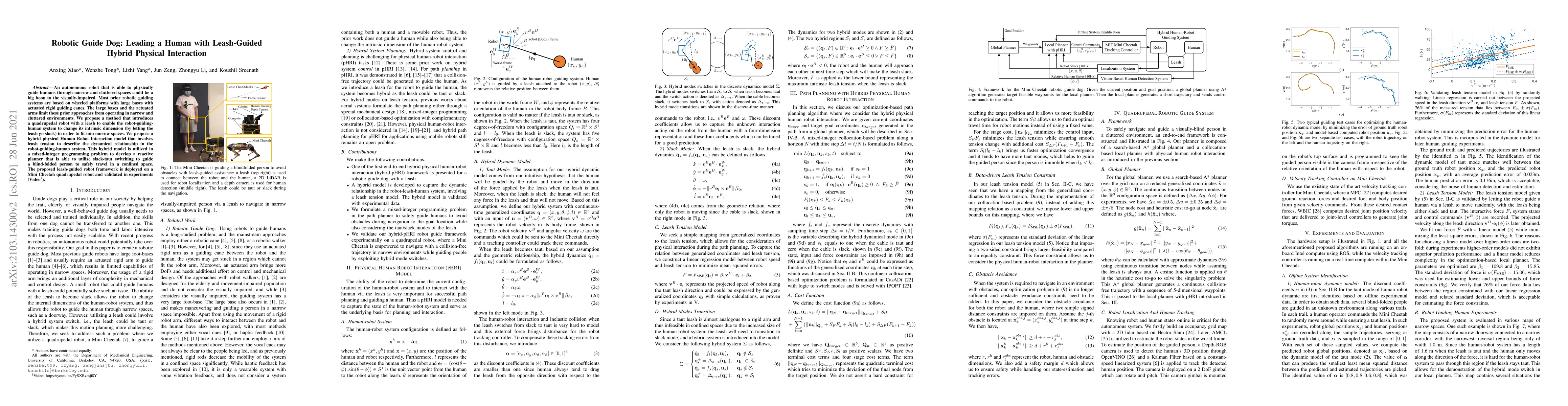A robotic guide dog with a leash allows visually-impaired people to navigate narrow spaces safely. The system uses a hybrid physical Human-Robot Interaction model and reactive planning to adapt to changing environments.