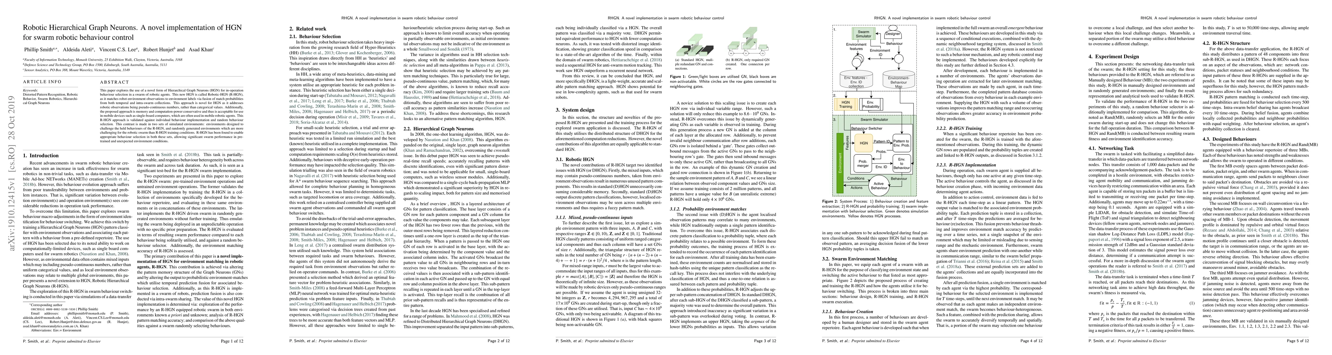 This paper explores the use of a novel form of Hierarchical Graph Neurons (HGN) for in-operation behaviour selection in a swarm of robotic agents. This new HGN is called Robotic-HGN (R-HGN), as it matches robot environment observations to environment labels via fusion of match probabilities from both temporal and intra-swarm collections. This approach is novel for HGN as it addresses robotic observations being pseudo-continuous numbers, rather than categorical values. Additionally, the proposed approach is memory and computation-power conservative and thus is acceptable for use in mobile devices such as single-board computers, which are often used in mobile robotic agents. This R-HGN approach is validated against individual behaviour implementation and random behaviour selection. This contrast is made in two sets of simulated environments: environments designed to challenge the held behaviours of the R-HGN, and randomly generated environments which are more challenging for the robotic swarm than R-HGN training conditions. R-HGN has been found to enable appropriate behaviour selection in both these sets, allowing significant swarm performance in pre-trained and unexpected environment conditions.