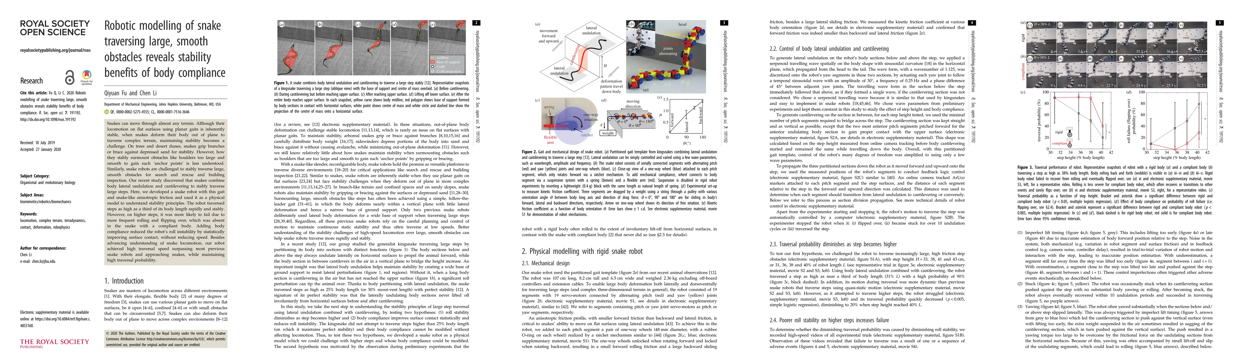 This study investigates how snake robots can stably traverse large, smooth obstacles by mimicking the stability benefits of snake body compliance. The robot's compliant design improved surface contact and reduced roll instability, achieving high traversal speed and probability while maintaining stability.