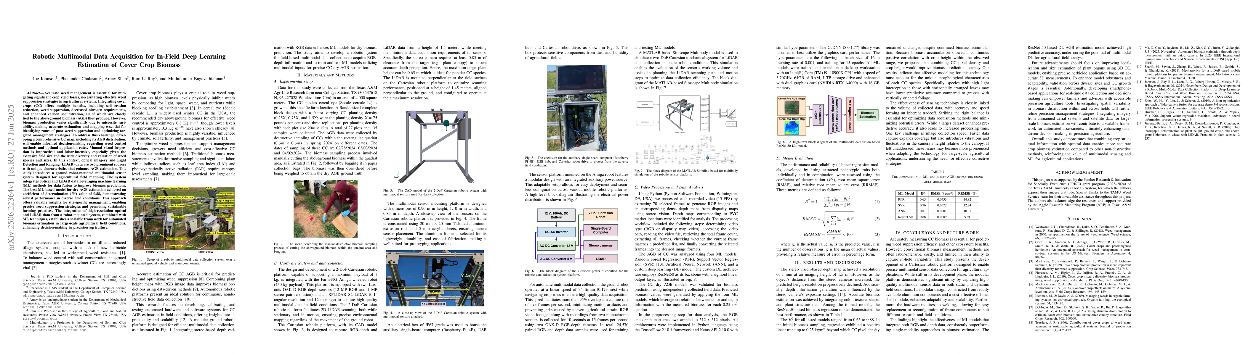 Accurate weed management is essential for mitigating significant crop yield losses, necessitating effective weed suppression strategies in agricultural systems. Integrating cover crops (CC) offers multiple benefits, including soil erosion reduction, weed suppression, decreased nitrogen requirements, and enhanced carbon sequestration, all of which are closely tied to the aboveground biomass (AGB) they produce. However, biomass production varies significantly due to microsite variability, making accurate estimation and mapping essential for identifying zones of poor weed suppression and optimizing targeted management strategies. To address this challenge, developing a comprehensive CC map, including its AGB distribution, will enable informed decision-making regarding weed control methods and optimal application rates. Manual visual inspection is impractical and labor-intensive, especially given the extensive field size and the wide diversity and variation of weed species and sizes. In this context, optical imagery and Light Detection and Ranging (LiDAR) data are two prominent sources with unique characteristics that enhance AGB estimation. This study introduces a ground robot-mounted multimodal sensor system designed for agricultural field mapping. The system integrates optical and LiDAR data, leveraging machine learning (ML) methods for data fusion to improve biomass predictions. The best ML-based model for dry AGB estimation achieved a coefficient of determination value of 0.88, demonstrating robust performance in diverse field conditions. This approach offers valuable insights for site-specific management, enabling precise weed suppression strategies and promoting sustainable farming practices.