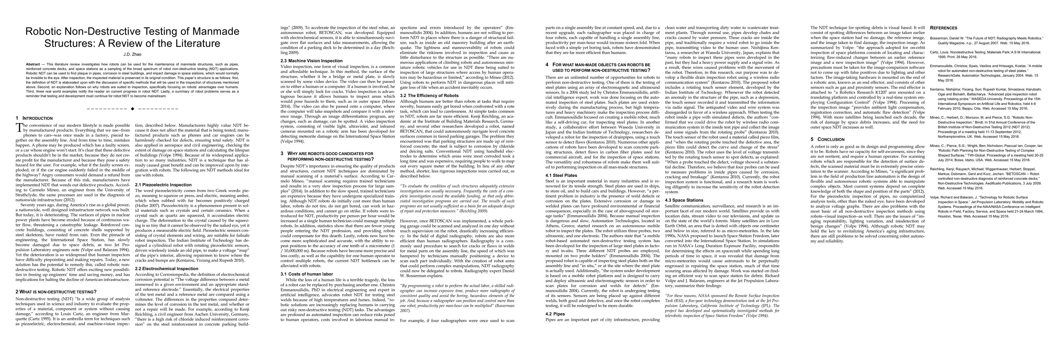 This literature review explores robotic non-destructive testing (NDT) for maintaining manmade structures, highlighting methods for detecting issues like plaque, corrosion, and impact damage. It emphasizes robots' advantages over humans for inspections and provides examples of current advancements in the field.