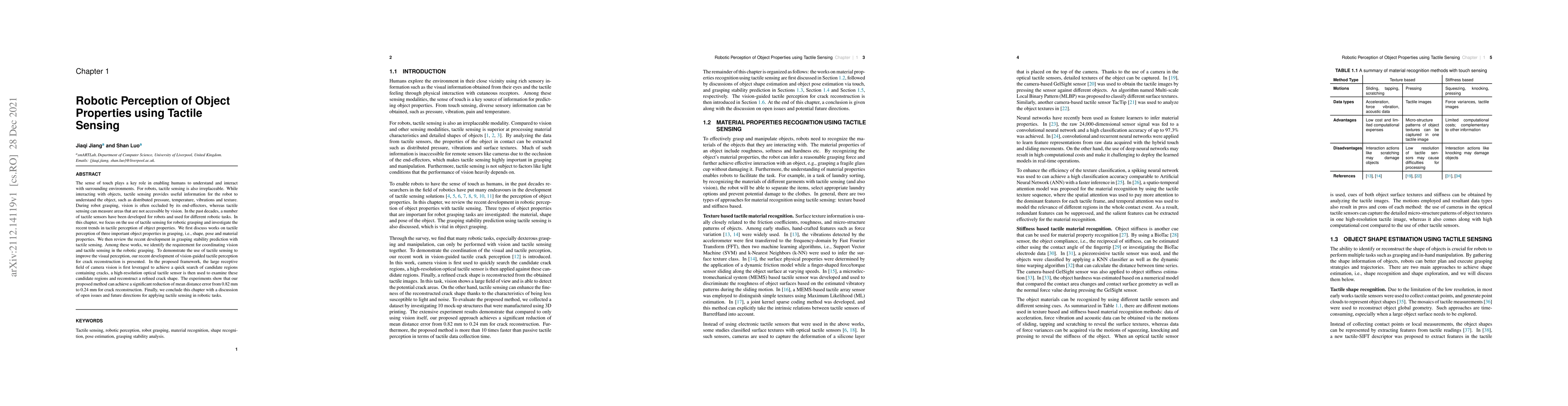 This paper explores the use of tactile sensing for robotic perception of object properties, focusing on shape, pose, and material properties during grasping. It highlights recent advancements in tactile sensing for stability prediction and integrates vision-guided tactile sensing to improve crack reconstruction accuracy, reducing mean distance error significantly.