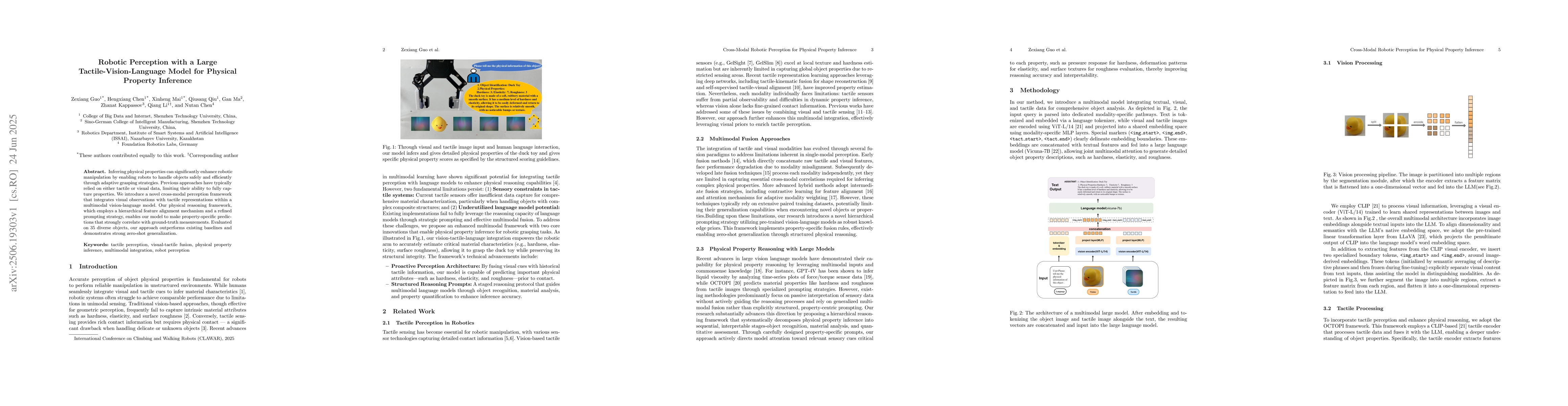 Inferring physical properties can significantly enhance robotic manipulation by enabling robots to handle objects safely and efficiently through adaptive grasping strategies. Previous approaches have typically relied on either tactile or visual data, limiting their ability to fully capture properties. We introduce a novel cross-modal perception framework that integrates visual observations with tactile representations within a multimodal vision-language model. Our physical reasoning framework, which employs a hierarchical feature alignment mechanism and a refined prompting strategy, enables our model to make property-specific predictions that strongly correlate with ground-truth measurements. Evaluated on 35 diverse objects, our approach outperforms existing baselines and demonstrates strong zero-shot generalization. Keywords: tactile perception, visual-tactile fusion, physical property inference, multimodal integration, robot perception