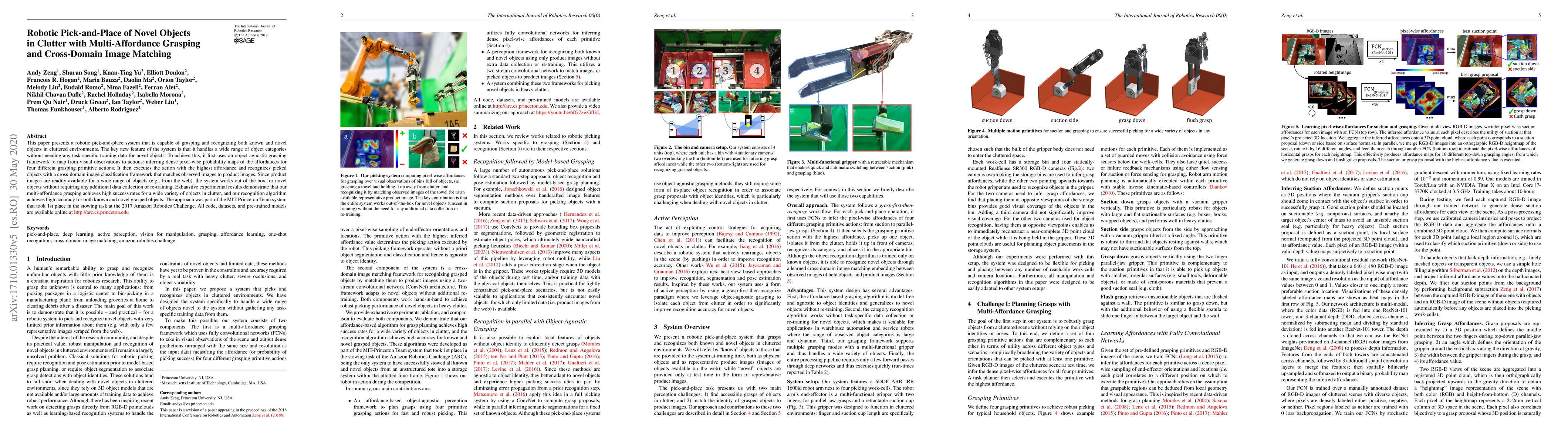 A robotic pick-and-place system can grasp and recognize both known and novel objects in cluttered environments without requiring task-specific training data for novel objects.
