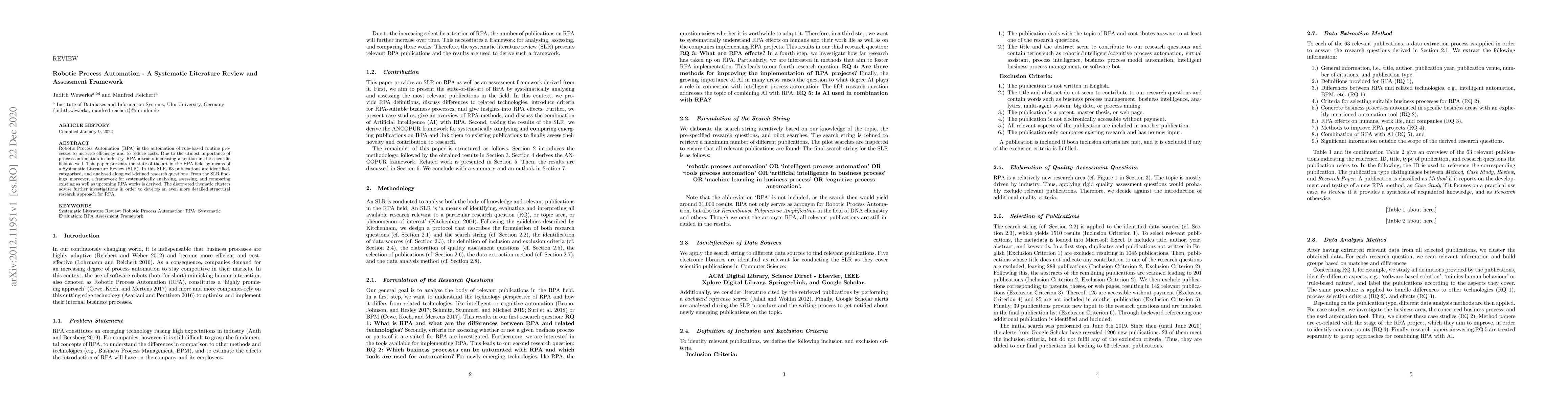 This paper conducts a Systematic Literature Review of Robotic Process Automation (RPA) to summarize current research trends and proposes a framework for assessing RPA studies, highlighting areas for future research to refine the structural approach in this field.