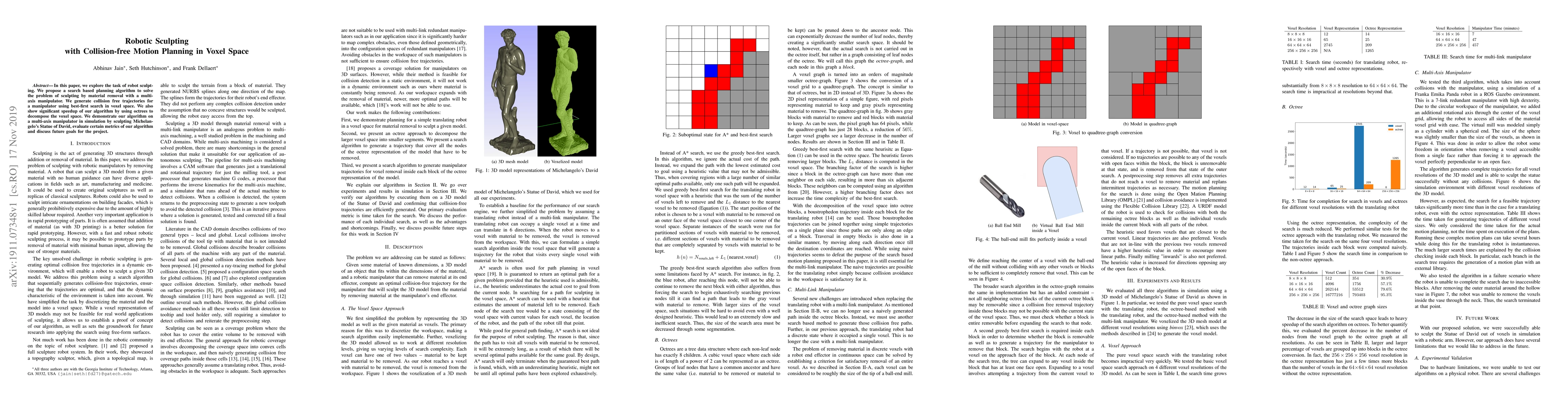 In this paper, we explore the task of robot sculpting. We propose a search based planning algorithm to solve the problem of sculpting by material removal with a multi-axis manipulator. We generate collision free trajectories for a manipulator using best-first search in voxel space. We also show significant speedup of our algorithm by using octrees to decompose the voxel space. We demonstrate our algorithm on a multi-axis manipulator in simulation by sculpting Michelangelo's Statue of David, evaluate certain metrics of our algorithm and discuss future goals for the project.