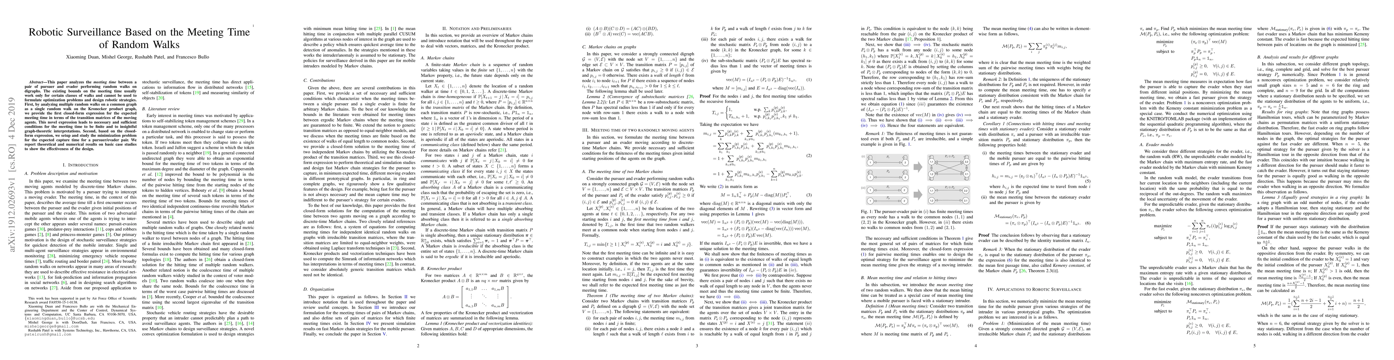 This paper analyzes the meeting time between a pair of pursuer and evader performing random walks on digraphs. The existing bounds on the meeting time usually work only for certain classes of walks and cannot be used to formulate optimization problems and design robotic strategies. First, by analyzing multiple random walks on a common graph as a single random walk on the Kronecker product graph, we provide the first closed-form expression for the expected meeting time in terms of the transition matrices of the moving agents. This novel expression leads to necessary and sufficient conditions for the meeting time to be finite and to insightful graph-theoretic interpretations. Second, based on the closed-form expression, we setup and study the minimization problem for the expected capture time for a pursuer/evader pair. We report theoretical and numerical results on basic case studies to show the effectiveness of the design.
