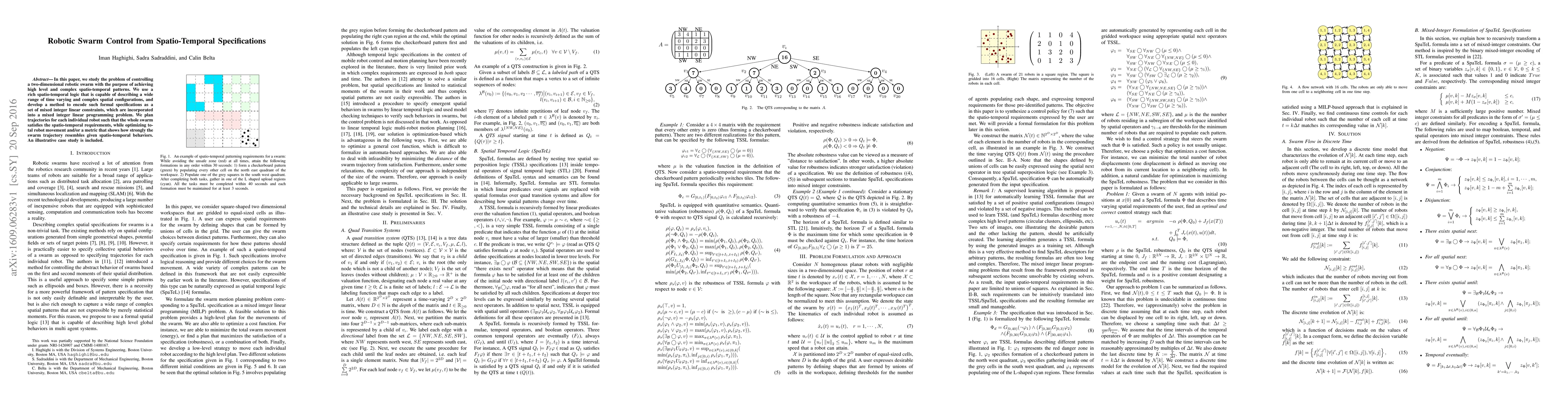 The paper presents a method to control a two-dimensional robotic swarm using spatio-temporal logic to achieve complex patterns, encoding these specifications as mixed integer linear constraints and optimizing total robot movement or similarity to given behaviors.